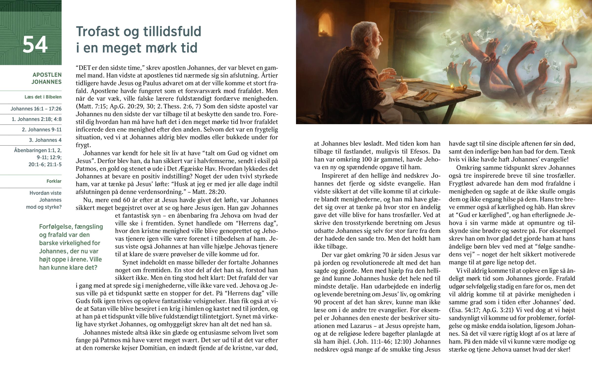 Vi vil aldrig komme til at opleve en lige så åndeligt mørk tid som Johannes gjorde. Frafald udgør selvfølgelig stadig en fare for os, men det vil aldrig komme til at påvirke menigheden i samme grad som i tiden efter Johannes’ død. (Esa. 54:17; Ap.G. 3:21) Vi ved dog at vi højst sandsynligt vil komme ud for problemer, forfølgelse og måske endda isolation, ligesom Johannes. Så det vil være rigtig klogt af os at lære af ham. På den måde vil vi kunne være modige og stærke og tjene Jehova uanset hvad der sker!