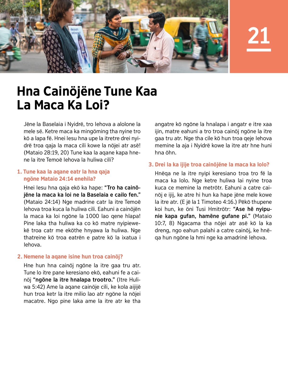 Hne hun hna cainöj ngöne la itre gaa tru atr. Tune lo itre pane keresiano ekö, eahuni fe a cainöj “ngöne la itre hnalapa trootro.” (Itre Huliwa 5:42) Ame la aqane cainöje cili, ke kola aijijë hun troa ketr la itre milio lao atr ngöne la nöjei macatre. Ngo pine laka ame la itre atr ke tha angatre kö ngöne la hnalapa i angatr e itre xaa ijin, matre eahuni a tro troa cainöj ngöne la itre gaa tru atr. Nge tha cile kö hun troa qeje Iehova memine la aja i Nyidrë kowe la itre atr hne huni hna öhn.