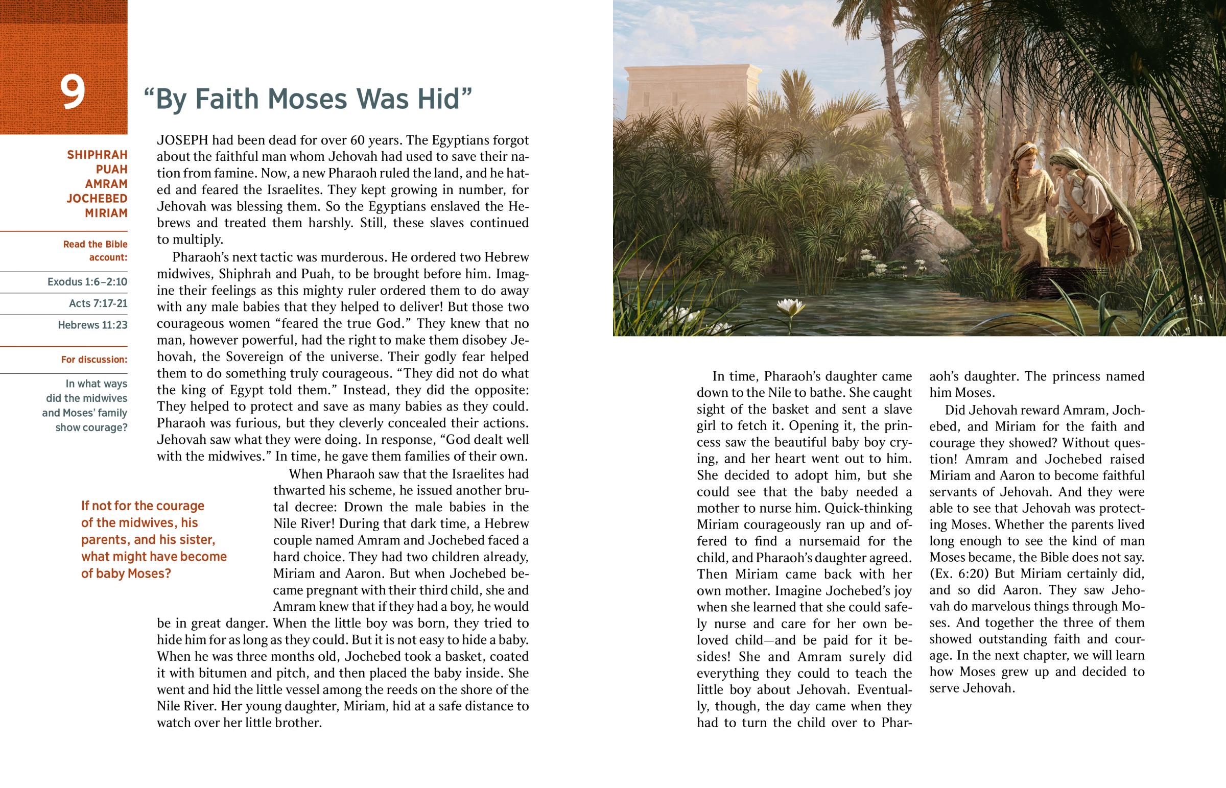 Did Jehovah reward Amram, Jochebed, and Miriam for the faith and courage they showed? Without question! Amram and Jochebed raised Miriam and Aaron to become faithful servants of Jehovah. And they were able to see that Jehovah was protecting Moses. Whether the parents lived long enough to see the kind of man Moses became, the Bible does not say. (Ex. 6:20) But Miriam certainly did, and so did Aaron. They saw Jehovah do marvelous things through Moses. And together the three of them showed outstanding faith and courage. In the next chapter, we will learn how Moses grew up and decided to serve Jehovah.