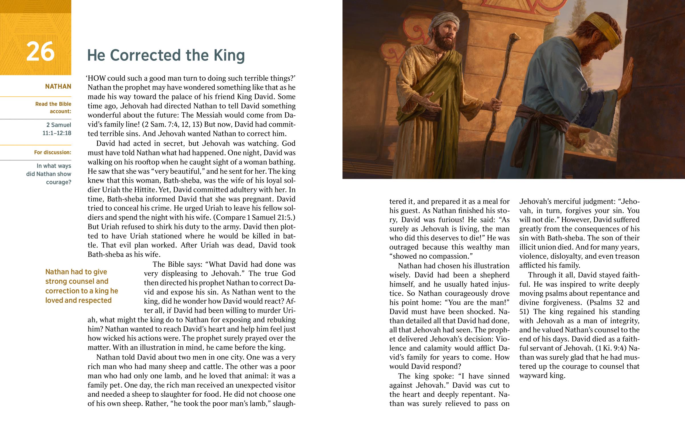 The Bible says: “What David had done was very displeasing to Jehovah.” The true God then directed his prophet Nathan to correct David and expose his sin. As Nathan went to the king, did he wonder how David would react? After all, if David had been willing to murder Uriah, what might the king do to Nathan for exposing and rebuking him? Nathan wanted to reach David’s heart and help him feel just how wicked his actions were. The prophet surely prayed over the matter. With an illustration in mind, he came before the king.