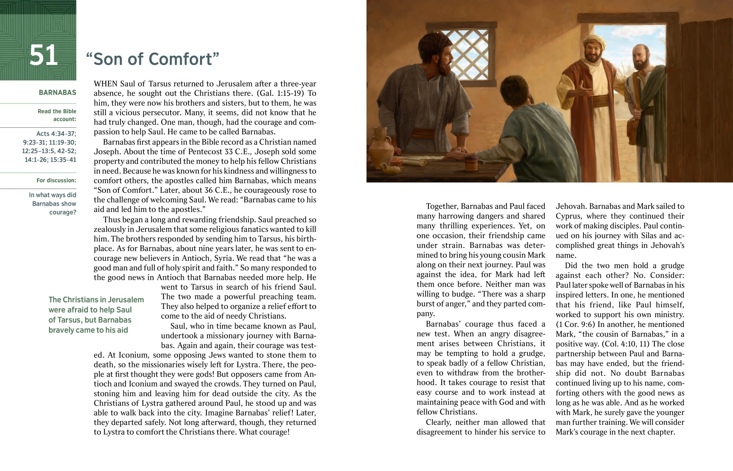 Did the two men hold a grudge against each other? No. Consider: Paul later spoke well of Barnabas in his inspired letters. In one, he mentioned that his friend, like Paul himself, worked to support his own ministry. (1 Cor. 9:6) In another, he mentioned Mark, “the cousin of Barnabas,” in a positive way. (Col. 4:10, 11) The close partnership between Paul and Barnabas may have ended, but the friendship did not. No doubt Barnabas continued living up to his name, comforting others with the good news as long as he was able. And as he worked with Mark, he surely gave the younger man further training. We will consider Mark’s courage in the next chapter.