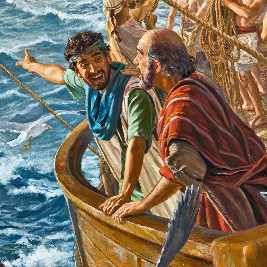 Página 124 Pablo y Timoteo viajan en un barco mercante romano. A lo lejos se ve un faro.
