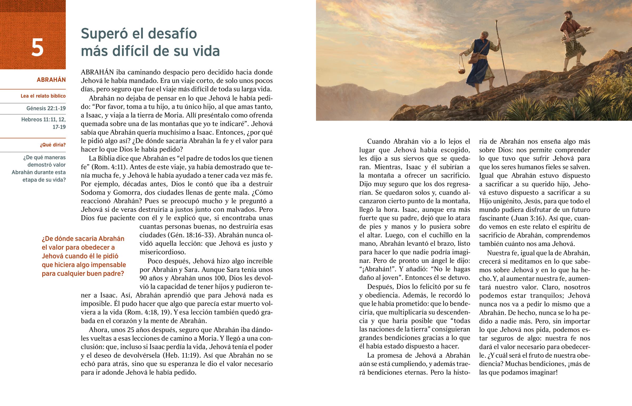 Cuando Abrahán vio a lo lejos el lugar que Jehová había escogido, les dijo a sus siervos que se quedaran. Mientras, Isaac y él subirían a la montaña a ofrecer un sacrificio. Dijo muy seguro que los dos regresarían. Se quedaron solos y, cuando alcanzaron cierto punto de la montaña, llegó la hora. Isaac, aunque era más fuerte que su padre, dejó que lo atara de pies y manos y lo pusiera sobre el altar. Luego, con el cuchillo en la mano, Abrahán levantó el brazo, listo para hacer lo que nadie podría imaginar. Pero de pronto un ángel le dijo: “¡Abrahán!”. Y añadió: “No le hagas daño al joven”. Entonces él se detuvo.