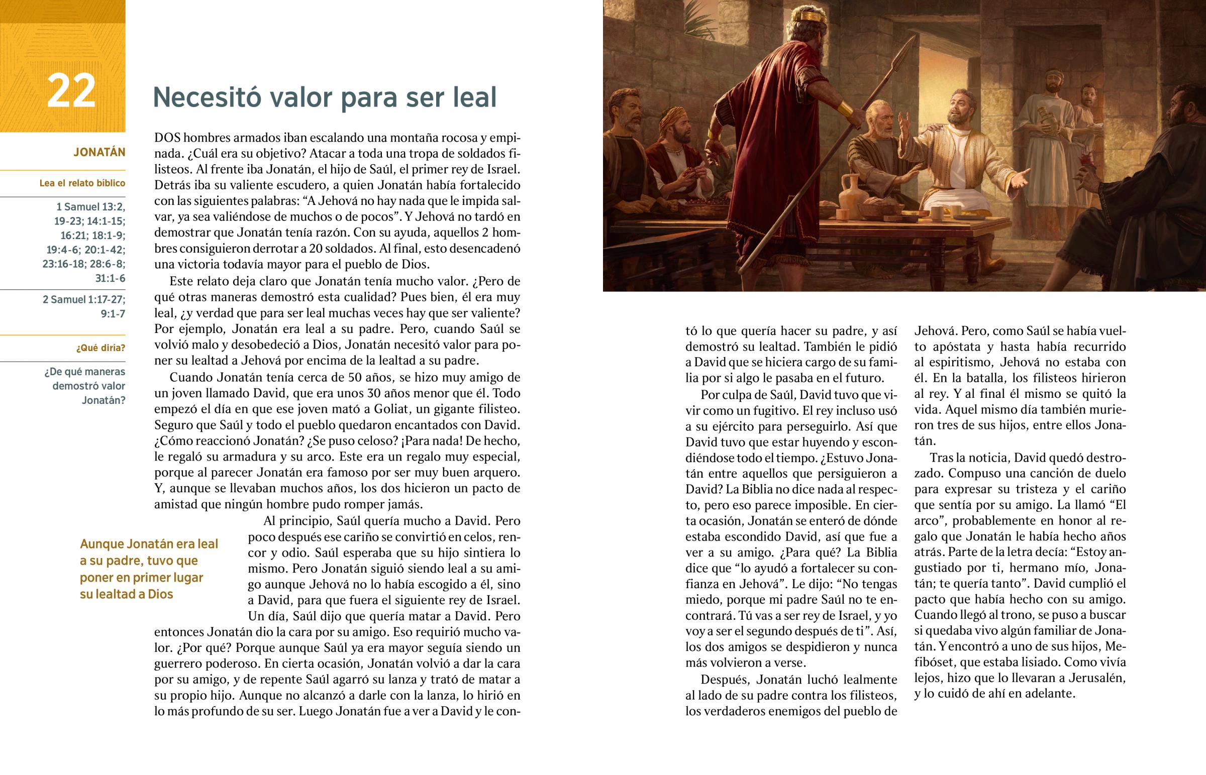 Al principio, Saúl quería mucho a David. Pero poco después ese cariño se convirtió en celos, rencor y odio. Saúl esperaba que su hijo sintiera lo mismo. Pero Jonatán siguió siendo leal a su amigo aunque Jehová no lo había escogido a él, sino a David, para que fuera el siguiente rey de Israel. Un día, Saúl dijo que quería matar a David. Pero entonces Jonatán dio la cara por su amigo. Eso requirió mucho valor. ¿Por qué? Porque aunque Saúl ya era mayor seguía siendo un guerrero poderoso. En cierta ocasión, Jonatán volvió a dar la cara por su amigo, y de repente Saúl agarró su lanza y trató de matar a su propio hijo. Aunque no alcanzó a darle con la lanza, lo hirió en lo más profundo de su ser. Luego Jonatán fue a ver a David y le contó lo que quería hacer su padre, y así demostró su lealtad. También le pidió a David que se hiciera cargo de su familia por si algo le pasaba en el futuro.