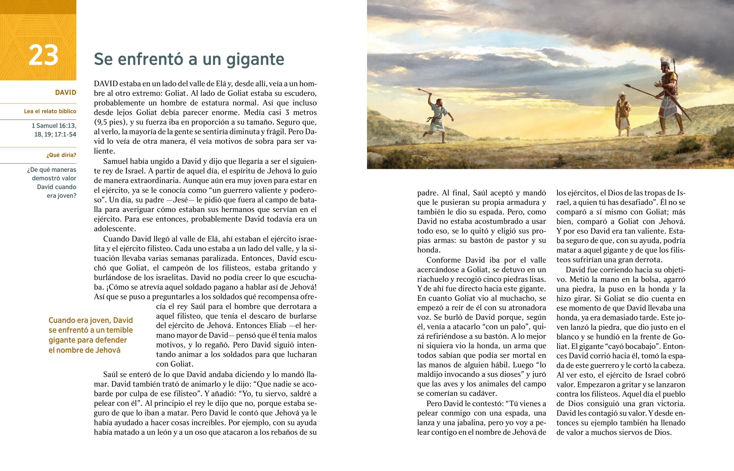 David fue corriendo hacia su objetivo. Metió la mano en la bolsa, agarró una piedra, la puso en la honda y la hizo girar. Si Goliat se dio cuenta en ese momento de que David llevaba una honda, ya era demasiado tarde. Este joven lanzó la piedra, que dio justo en el blanco y se hundió en la frente de Goliat. El gigante “cayó bocabajo”. Entonces David corrió hacia él, tomó la espada de este guerrero y le cortó la cabeza. Al ver esto, el ejército de Israel cobró valor. Empezaron a gritar y se lanzaron contra los filisteos. Aquel día el pueblo de Dios consiguió una gran victoria. David les contagió su valor. Y desde entonces su ejemplo también ha llenado de valor a muchos siervos de Dios.