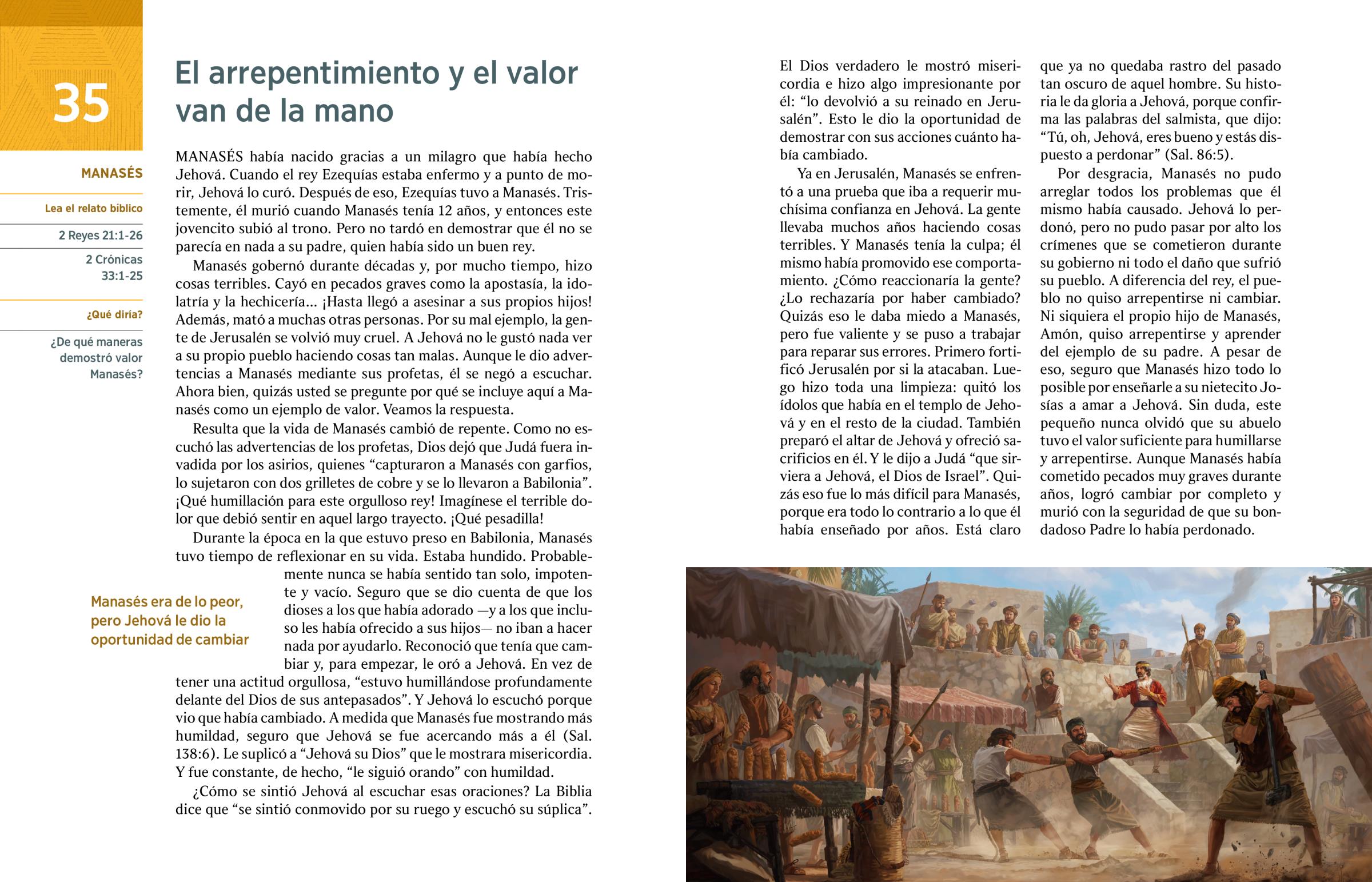 Por desgracia, Manasés no pudo arreglar todos los problemas que él mismo había causado. Jehová lo perdonó, pero no pudo pasar por alto los crímenes que se cometieron durante su gobierno ni todo el daño que sufrió su pueblo. A diferencia del rey, el pueblo no quiso arrepentirse ni cambiar. Ni siquiera el propio hijo de Manasés, Amón, quiso arrepentirse y aprender del ejemplo de su padre. A pesar de eso, seguro que Manasés hizo todo lo posible por enseñarle a su nietecito Josías a amar a Jehová. Sin duda, este pequeño nunca olvidó que su abuelo tuvo el valor suficiente para humillarse y arrepentirse. Aunque Manasés había cometido pecados muy graves durante años, logró cambiar por completo y murió con la seguridad de que su bondadoso Padre lo había perdonado.