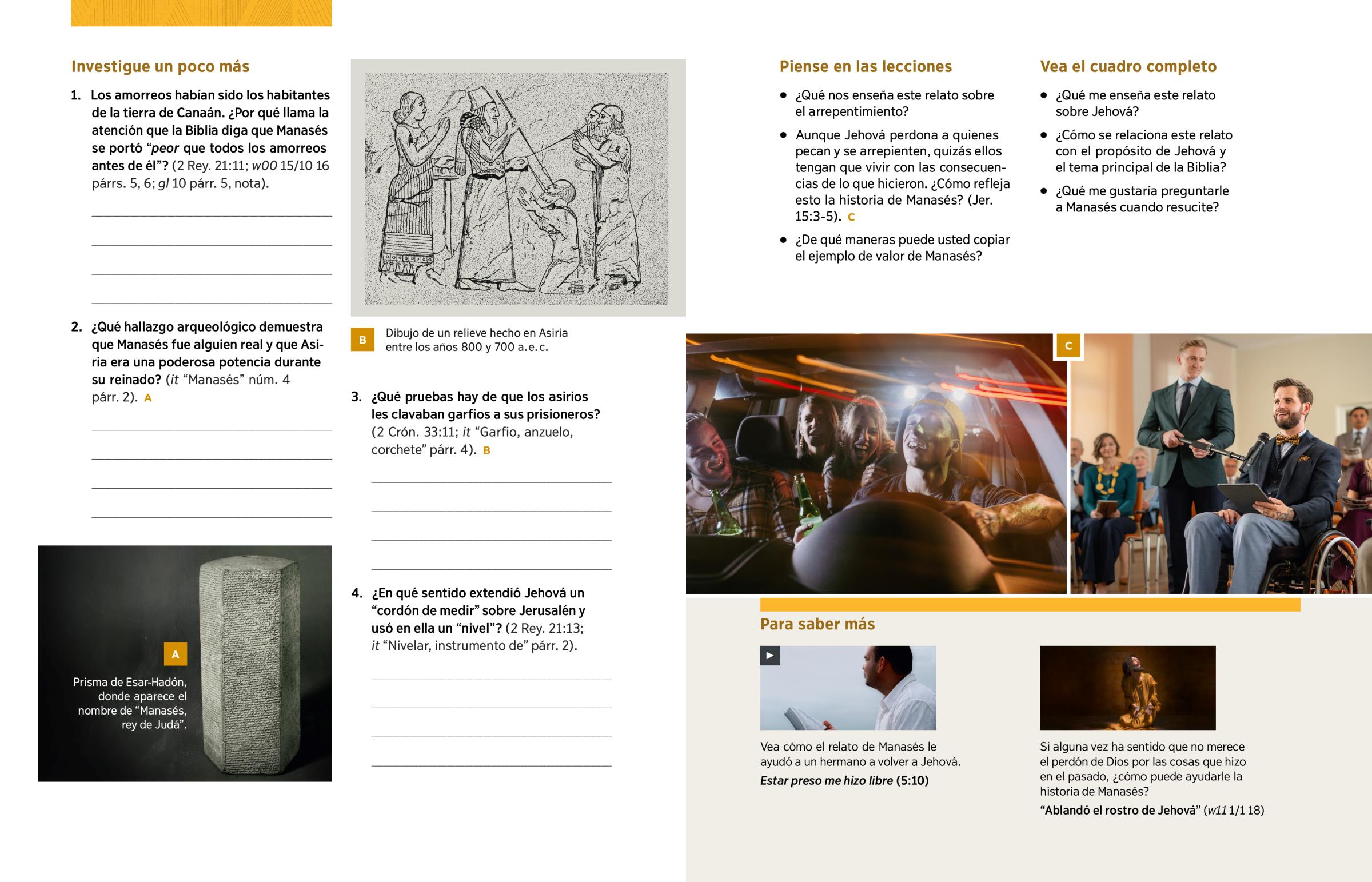 1. 1. Los amorreos habían sido los habitantes de la tierra de Canaán. ¿Por qué llama la atención que la Biblia diga que Manasés se portó “peor que todos los amorreos antes de él”? (2 Rey. 21:11; w00 15/10 16 párrs. 5, 6; gl 10 párr. 5, nota).