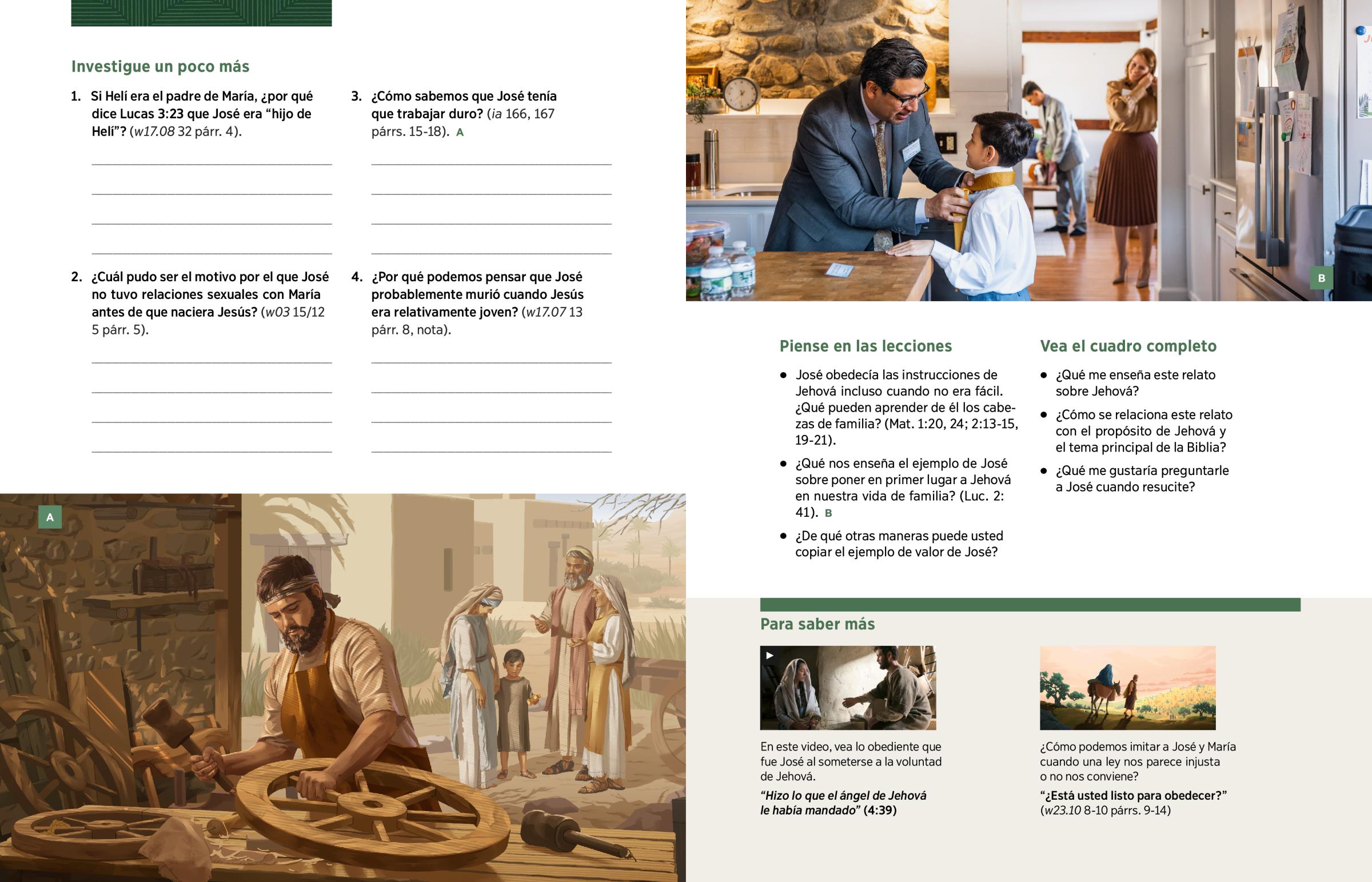 Allí, José trabajó muy duro en la carpintería para darles lo necesario a María, a Jesús y al resto de sus hijos, que por lo menos eran seis. José también le daba a su familia lo necesario en sentido espiritual, que es lo más importante. Iban a la sinagoga regularmente para aprender de Jehová y asistían juntos a las fiestas sagradas que había en Jerusalén. De hecho, la última vez que se menciona a José en la Biblia es cuando estaba en una de esas fiestas. Jesús tenía solo 12 años, y José y María pensaban que lo habían perdido. Imagínese a este padre tan responsable. ¡Debía estar desesperado! Qué alivio sintieron él y María cuando encontraron a Jesús sano y salvo. El niño regresó con sus padres a casa, y la Biblia dice que “continuó sujeto a ellos”.