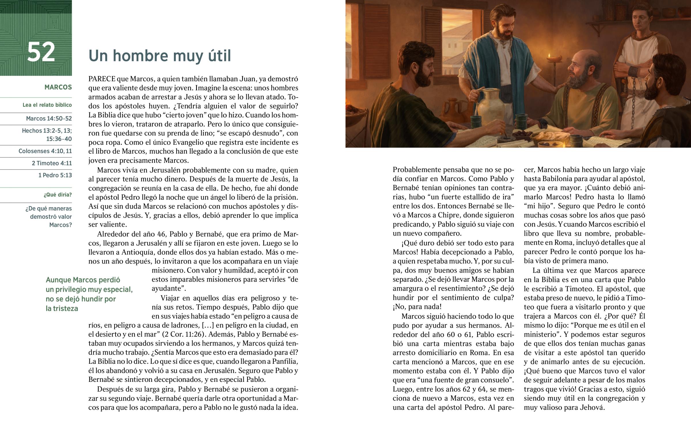 Marcos siguió haciendo todo lo que pudo por ayudar a sus hermanos. Alrededor del año 60 o 61, Pablo escribió una carta mientras estaba bajo arresto domiciliario en Roma. En esa carta mencionó a Marcos, que en ese momento estaba con él. Y Pablo dijo que era “una fuente de gran consuelo”. Luego, entre los años 62 y 64, se menciona de nuevo a Marcos, esta vez en una carta del apóstol Pedro. Al parecer, Marcos había hecho un largo viaje hasta Babilonia para ayudar al apóstol, que ya era mayor. ¡Cuánto debió animarlo Marcos! Pedro hasta lo llamó “mi hijo”. Seguro que Pedro le contó muchas cosas sobre los años que pasó con Jesús. Y cuando Marcos escribió el libro que lleva su nombre, probablemente en Roma, incluyó detalles que al parecer Pedro le contó porque los había visto de primera mano.