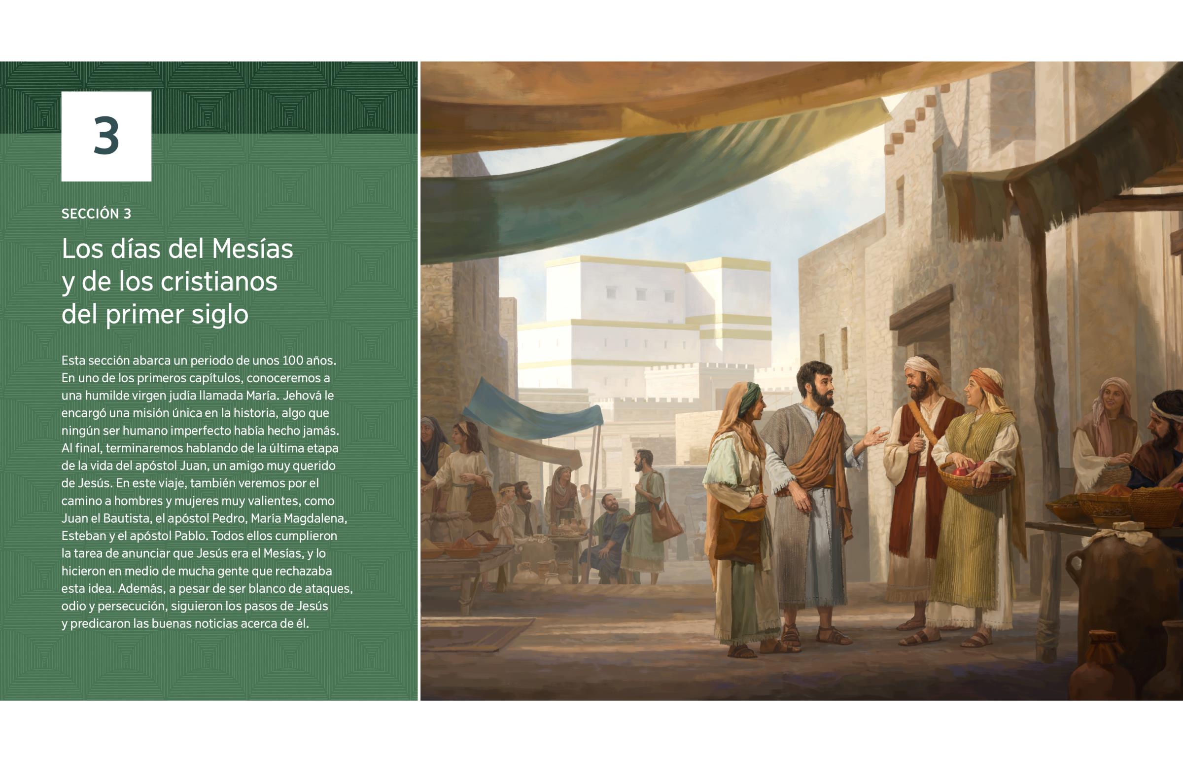 Esta sección abarca un periodo de unos 100 años. En uno de los primeros capítulos, conoceremos a una humilde virgen judía llamada María. Jehová le encargó una misión única en la historia, algo que ningún ser humano imperfecto había hecho jamás. Al final, terminaremos hablando de la última etapa de la vida del apóstol Juan, un amigo muy querido de Jesús. En este viaje, también veremos por el camino a hombres y mujeres muy valientes, como Juan el Bautista, el apóstol Pedro, María Magdalena, Esteban y el apóstol Pablo. Todos ellos cumplieron la tarea de anunciar que Jesús era el Mesías, y lo hicieron en medio de mucha gente que rechazaba esta idea. Además, a pesar de ser blanco de ataques, odio y persecución, siguieron los pasos de Jesús y predicaron las buenas noticias acerca de él.