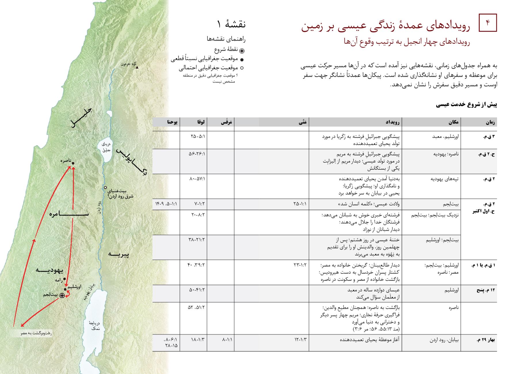 به همراه جدولهای زمانی، نقشههایی نیز آمده است که در آنها مسیر حرکت عیسی برای موعظه و سفرهای او نشانهگذاری شده است. پیکانها عمدتاً نشانگر جهت سفر اوست و مسیر دقیق سفرش را نشان نمیدهد.