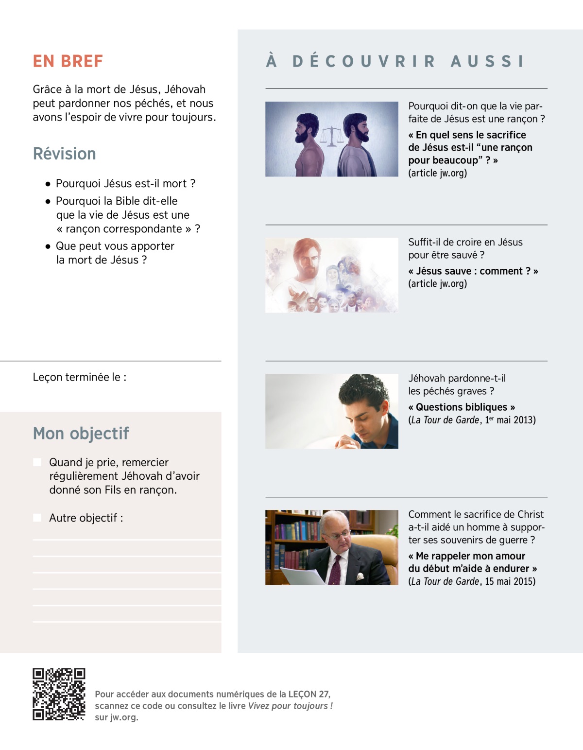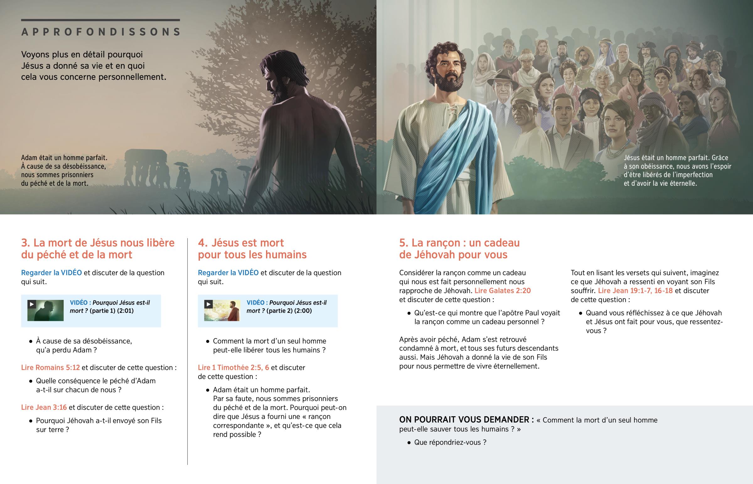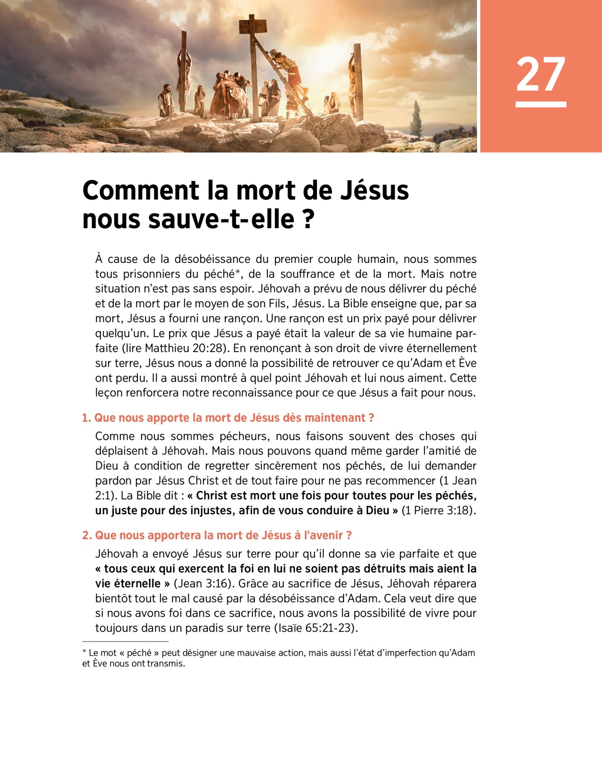 À cause de la désobéissance du premier couple humain, nous sommes tous prisonniers du péchéa, de la souffrance et de la mort. Mais notre situation n’est pas sans espoir. Jéhovah a prévu de nous délivrer du péché et de la mort par le moyen de son Fils, Jésus. La Bible enseigne que, par sa mort, Jésus a fourni une rançon. Une rançon est un prix payé pour délivrer quelqu’un. Le prix que Jésus a payé était la valeur de sa vie humaine parfaite (lire Matthieu 20:28). En renonçant à son droit de vivre éternellement sur terre, Jésus nous a donné la possibilité de retrouver ce qu’Adam et Ève ont perdu. Il a aussi montré à quel point Jéhovah et lui nous aiment. Cette leçon renforcera notre reconnaissance pour ce que Jésus a fait pour nous.