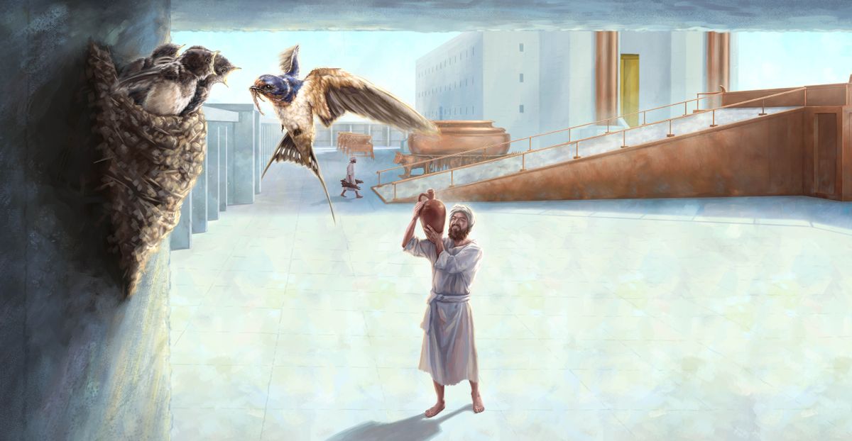 Un des fils de Coré regarde avec envie une hirondelle qui a fait son nid dans la cour du Temple.
