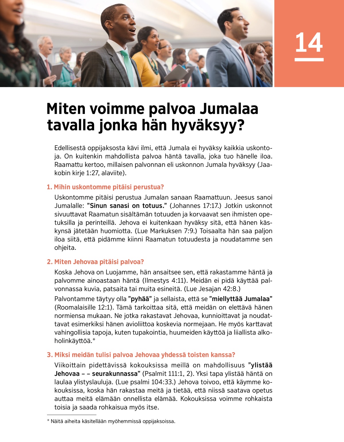 Edellisestä oppijaksosta kävi ilmi, että Jumala ei hyväksy kaikkia uskontoja. On kuitenkin mahdollista palvoa häntä tavalla, joka tuo hänelle iloa. Raamattu kertoo, millaisen palvonnan eli uskonnon Jumala hyväksyy (Jaakobin kirje 1:27, alaviite).