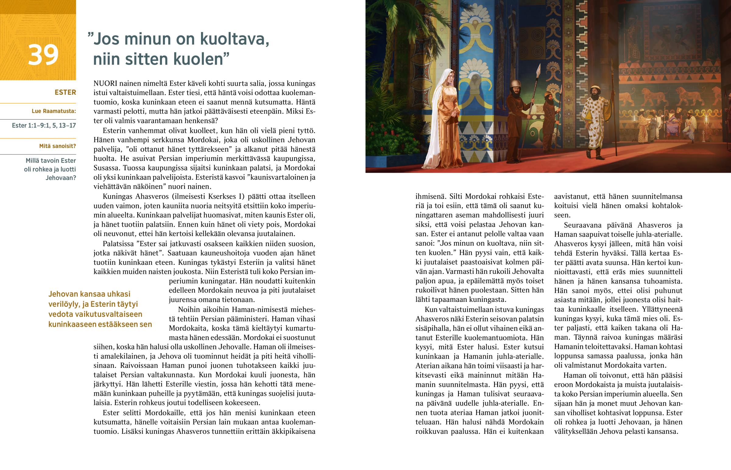 NUORI nainen nimeltä Ester käveli kohti suurta salia, jossa kuningas istui valtaistuimellaan. Ester tiesi, että häntä voisi odottaa kuolemantuomio, koska kuninkaan eteen ei saanut mennä kutsumatta. Häntä varmasti pelotti, mutta hän jatkoi päättäväisesti eteenpäin. Miksi Ester oli valmis vaarantamaan henkensä?
