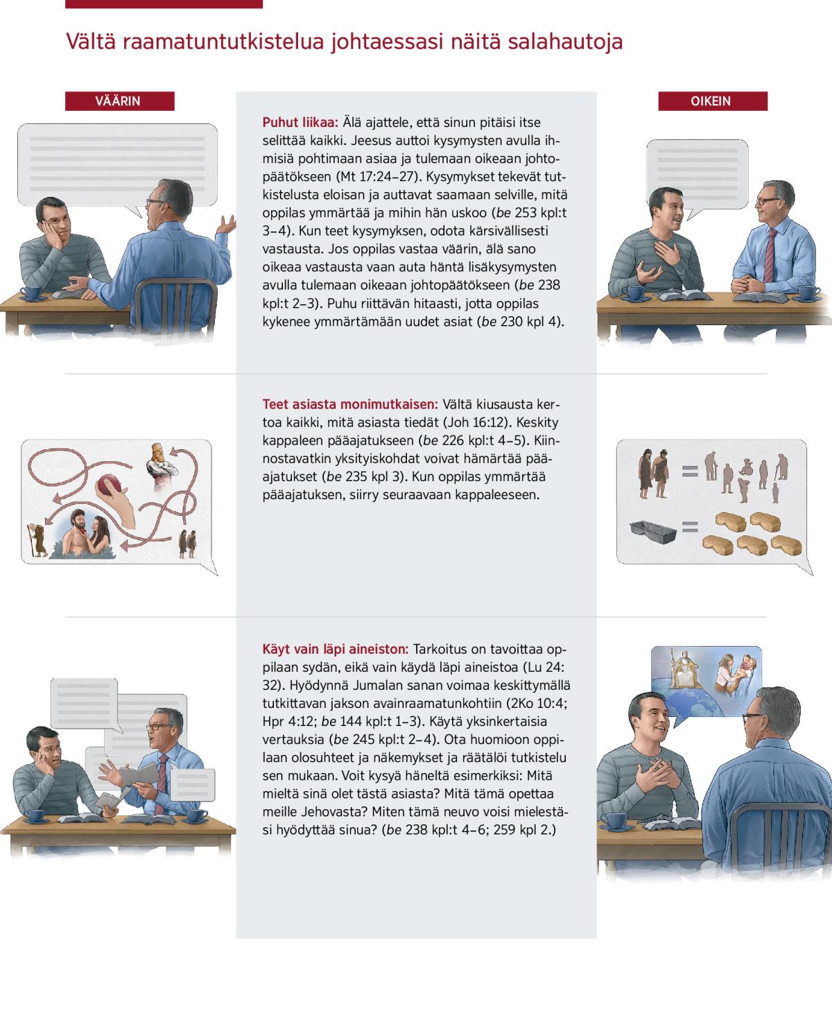 Käyt vain läpi aineiston: Tarkoitus on tavoittaa oppilaan sydän, eikä vain käydä läpi aineistoa (Lu 24:32). Hyödynnä Jumalan sanan voimaa keskittymällä tutkittavan jakson avainraamatunkohtiin (2Ko 10:4; Hpr 4:12; be 144 kpl:t 1–3). Käytä yksinkertaisia vertauksia (be 245 kpl:t 2–4). Ota huomioon oppilaan olosuhteet ja näkemykset ja räätälöi tutkistelu sen mukaan. Voit kysyä häneltä esimerkiksi: Mitä mieltä sinä olet tästä asiasta? Mitä tämä opettaa meille Jehovasta? Miten tämä neuvo voisi mielestäsi hyödyttää sinua? (be 238 kpl:t 4–6; 259 kpl 2.)
