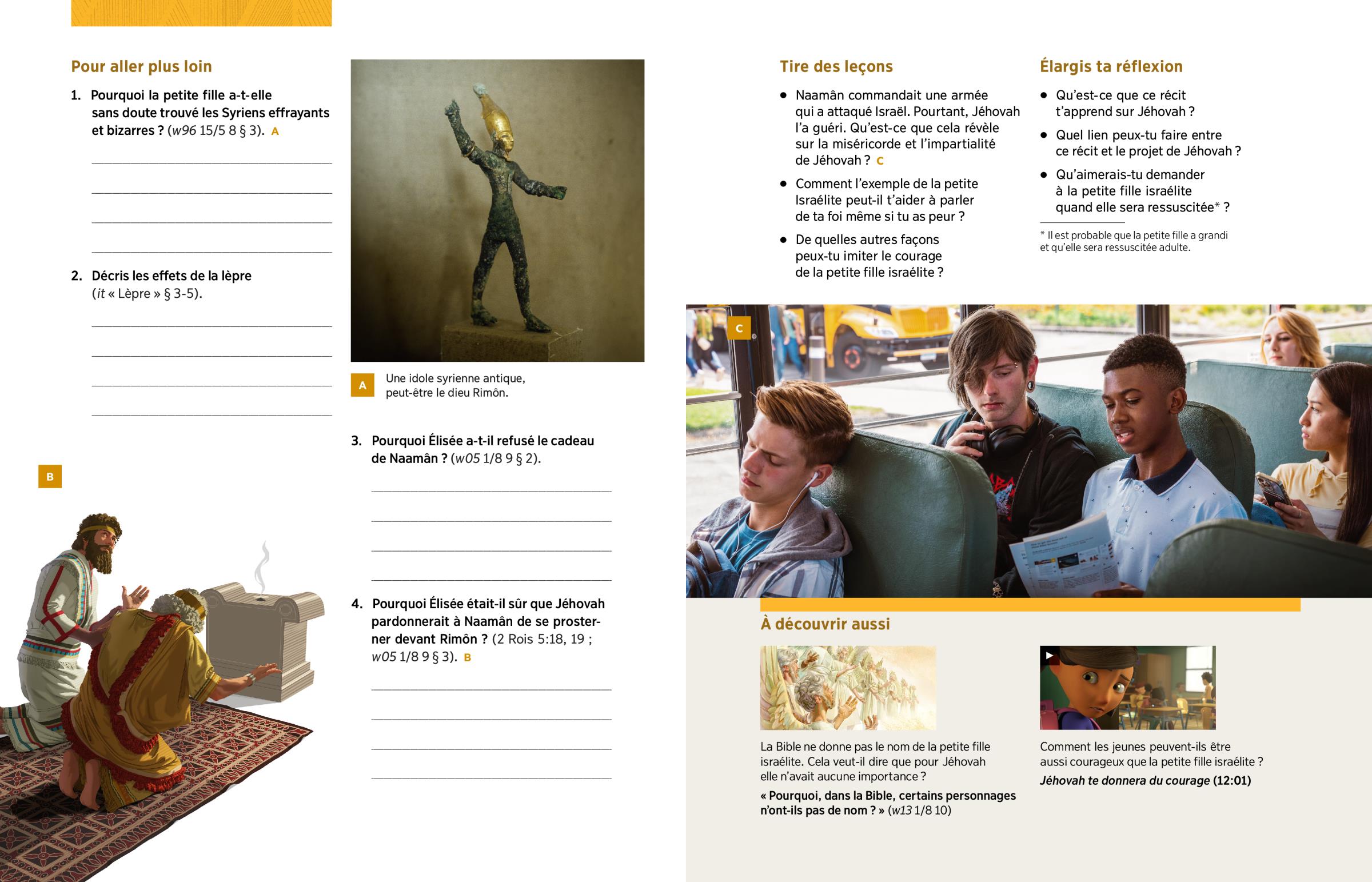 La fillette doit être très attentive au récit de Naamân : elle découvre comment Élisée l’a accueilli, a mis à l’épreuve son humilité et l’a même mis en colère. Elle apprend que ses serviteurs l’ont persuadé de suivre les instructions simples du prophète, puis qu’il s’est plongé sept fois dans le Jourdain et en est finalement ressorti débarrassé de la lèpre. Mais plus important encore : Naamân est devenu un adorateur de Jéhovah comme elle !