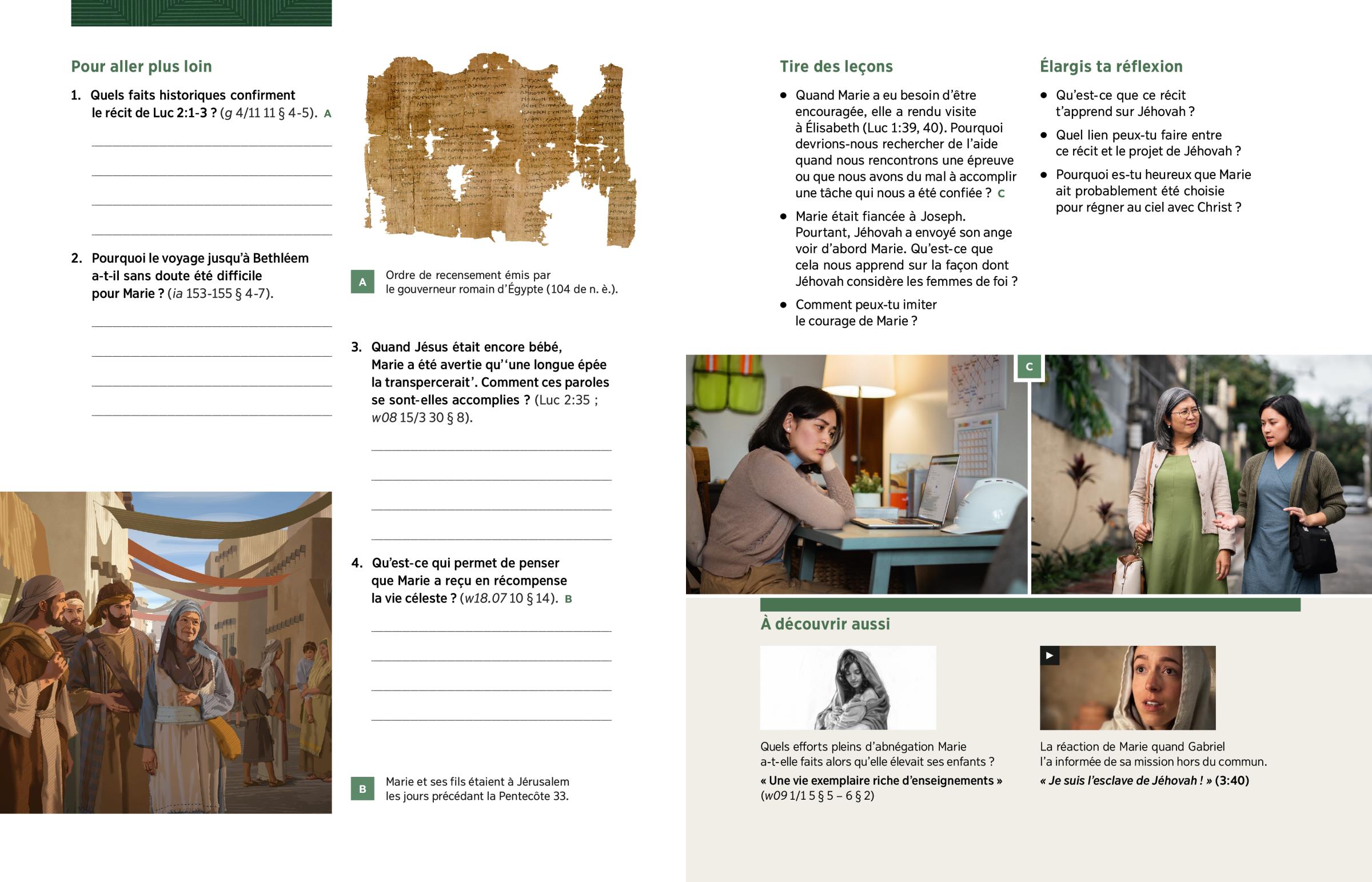 Joseph épouse Marie. Plus tard, bien que le moment de la naissance approche, il l’emmène avec lui à Bethléem parce qu’un décret de César exige que toute la population se fasse enregistrer. Dans son état, Marie doit s’inquiéter à l’idée de faire un voyage d’environ 150 kilomètres à dos d’âne. Mais elle y va quand même. Finalement, elle doit donner naissance à son bébé dans une étable et le coucher dans une mangeoire. Pourtant, elle ne perd pas courage. Elle est déterminée à faire tout ce qu’elle peut avec ce qu’elle a pour prendre soin de ce fils si précieux.