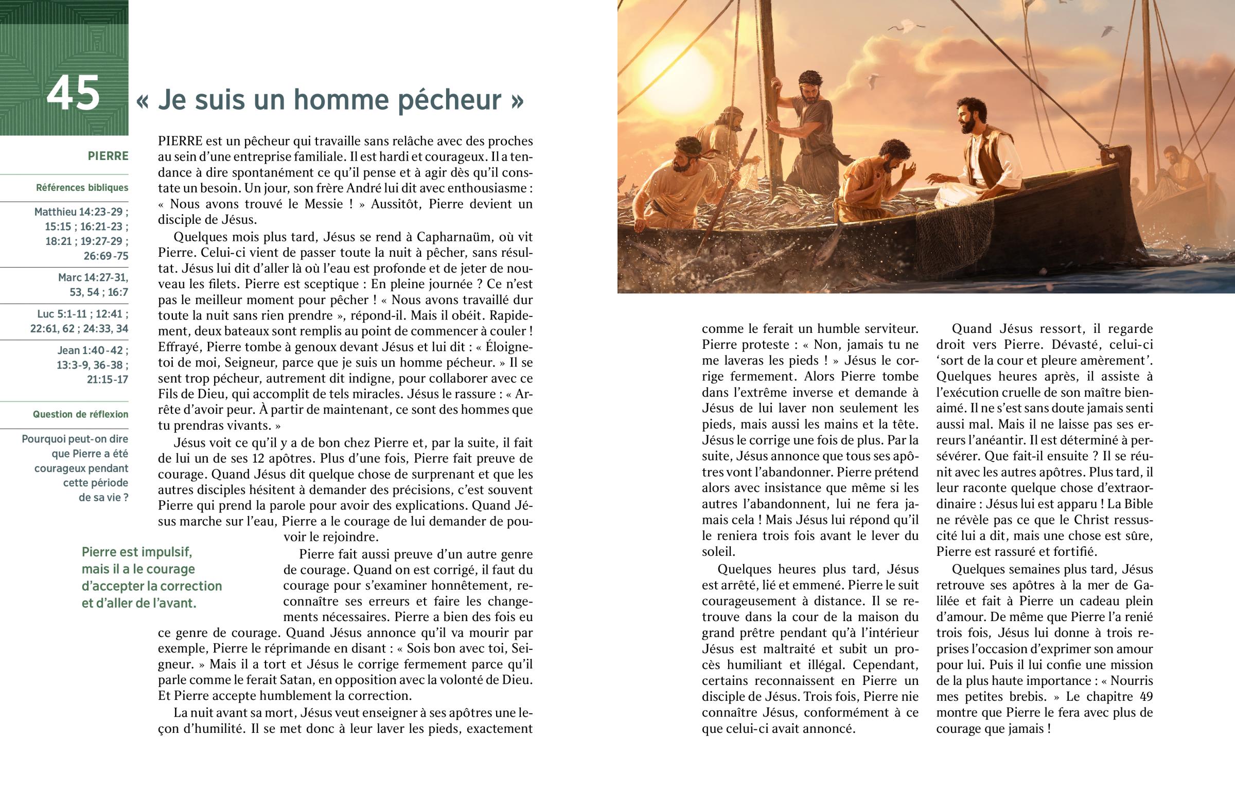 Quelques semaines plus tard, Jésus retrouve ses apôtres à la mer de Galilée et fait à Pierre un cadeau plein d’amour. De même que Pierre l’a renié trois fois, Jésus lui donne à trois reprises l’occasion d’exprimer son amour pour lui. Puis il lui confie une mission de la plus haute importance : « Nourris mes petites brebis. » Le chapitre 49 montre que Pierre le fera avec plus de courage que jamais !