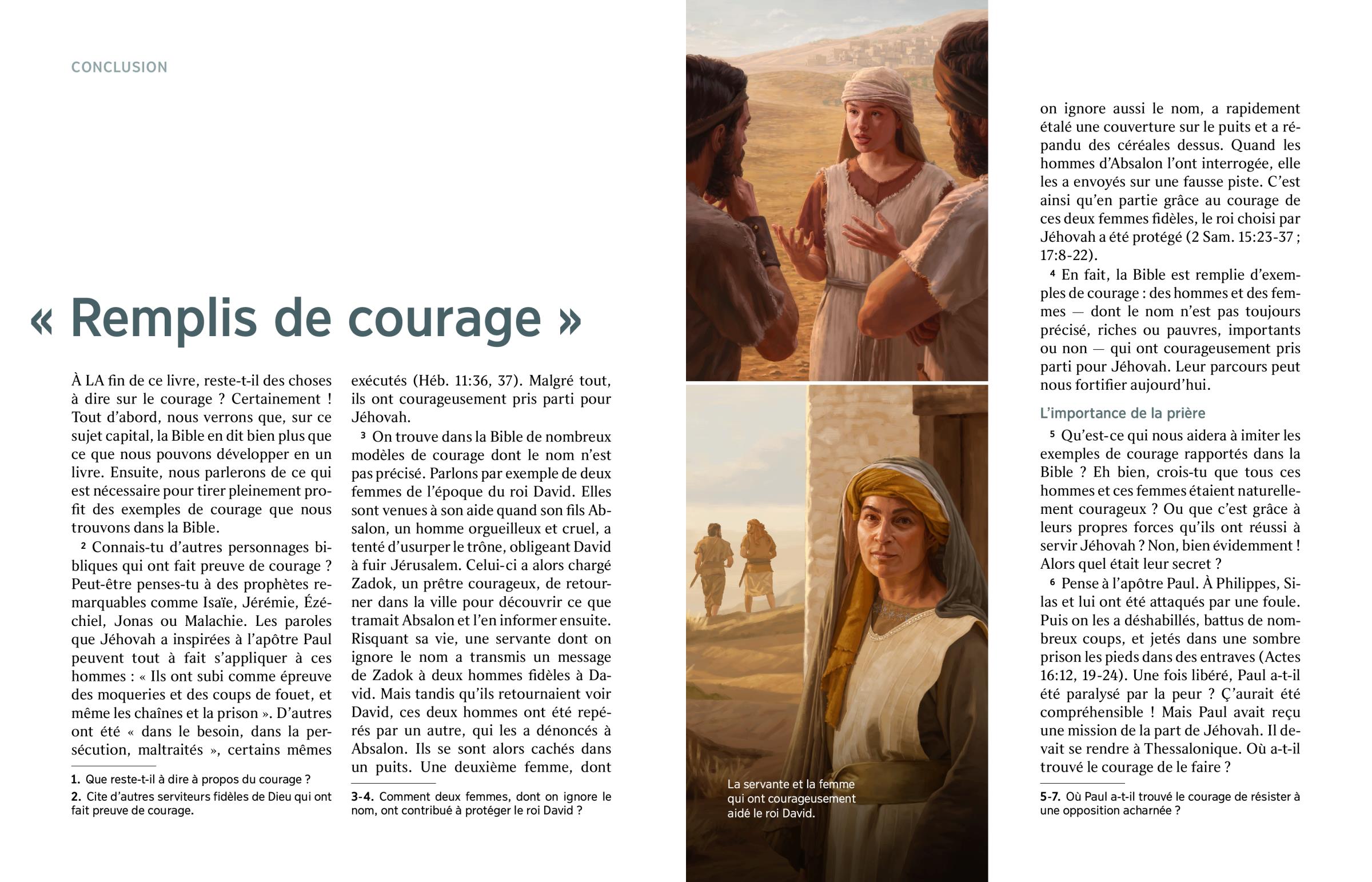3 On trouve dans la Bible de nombreux modèles de courage dont le nom n’est pas précisé. Parlons par exemple de deux femmes de l’époque du roi David. Elles sont venues à son aide quand son fils Absalon, un homme orgueilleux et cruel, a tenté d’usurper le trône, obligeant David à fuir Jérusalem. Celui-ci a alors chargé Zadok, un prêtre courageux, de retourner dans la ville pour découvrir ce que tramait Absalon et l’en informer ensuite. Risquant sa vie, une servante dont on ignore le nom a transmis un message de Zadok à deux hommes fidèles à David. Mais tandis qu’ils retournaient voir David, ces deux hommes ont été repérés par un autre, qui les a dénoncés à Absalon. Ils se sont alors cachés dans un puits. Une deuxième femme, dont on ignore aussi le nom, a rapidement étalé une couverture sur le puits et a répandu des céréales dessus. Quand les hommes d’Absalon l’ont interrogée, elle les a envoyés sur une fausse piste. C’est ainsi qu’en partie grâce au courage de ces deux femmes fidèles, le roi choisi par Jéhovah a été protégé (2 Sam. 15:23-37 ; 17:8-22).
