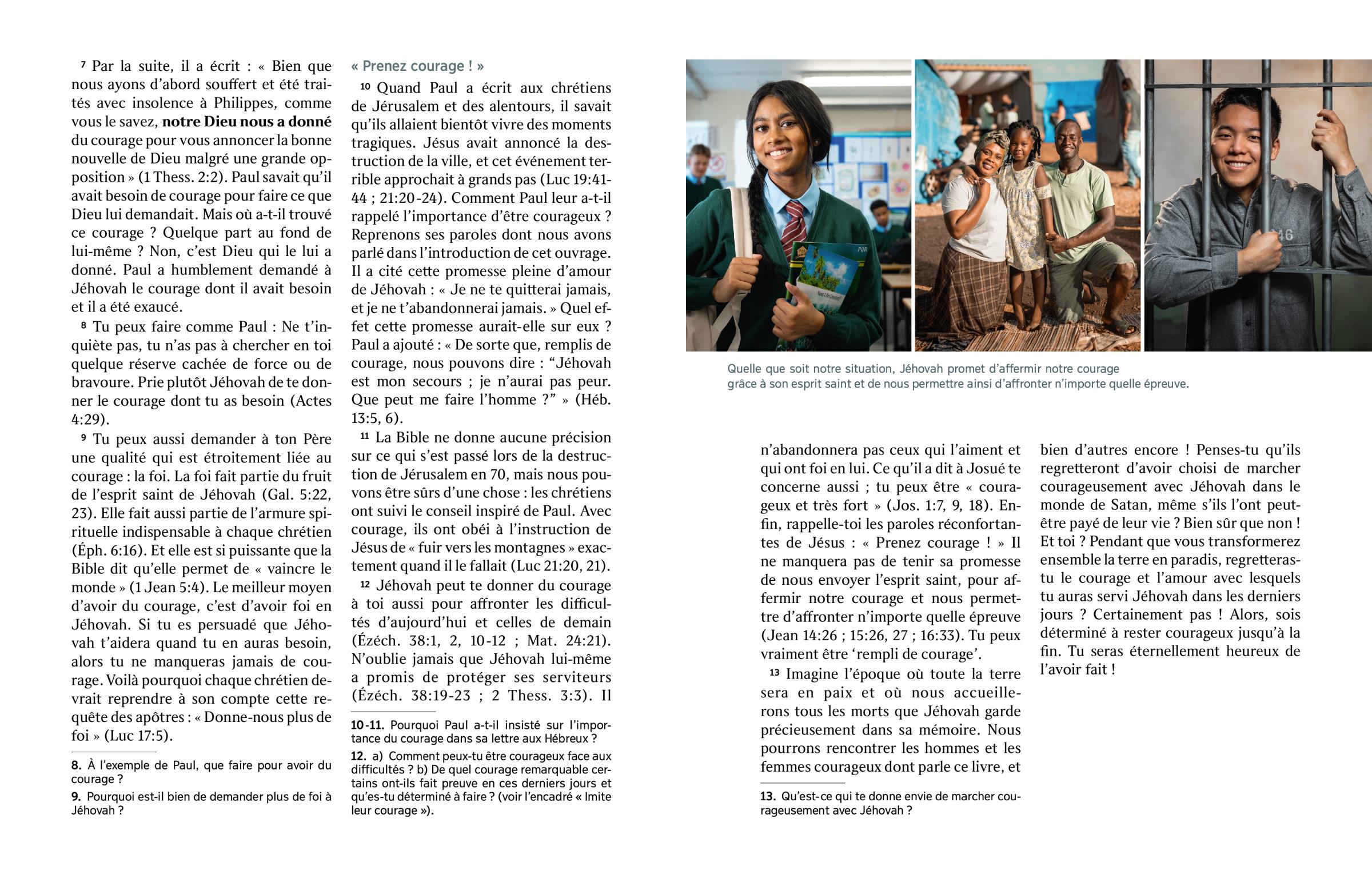 12 Jéhovah peut te donner du courage à toi aussi pour affronter les difficultés d’aujourd’hui et celles de demain (Ézéch. 38:1, 2, 10-12 ; Mat. 24:21). N’oublie jamais que Jéhovah lui-même a promis de protéger ses serviteurs (Ézéch. 38:19-23 ; 2 Thess. 3:3). Il n’abandonnera pas ceux qui l’aiment et qui ont foi en lui. Ce qu’il a dit à Josué te concerne aussi ; tu peux être « courageux et très fort » (Jos. 1:7, 9, 18). Enfin, rappelle-toi les paroles réconfortantes de Jésus : « Prenez courage ! » Il ne manquera pas de tenir sa promesse de nous envoyer l’esprit saint, pour affermir notre courage et nous permettre d’affronter n’importe quelle épreuve (Jean 14:26 ; 15:26, 27 ; 16:33). Tu peux vraiment être ‘rempli de courage’.