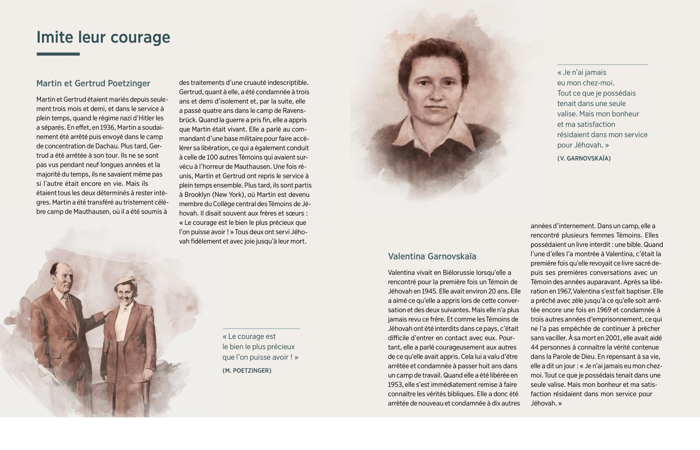 13 Imagine l’époque où toute la terre sera en paix et où nous accueillerons tous les morts que Jéhovah garde précieusement dans sa mémoire. Nous pourrons rencontrer les hommes et les femmes courageux dont parle ce livre, et bien d’autres encore ! Penses-tu qu’ils regretteront d’avoir choisi de marcher courageusement avec Jéhovah dans le monde de Satan, même s’ils l’ont peut-être payé de leur vie ? Bien sûr que non ! Et toi ? Pendant que vous transformerez ensemble la terre en paradis, regretteras-tu le courage et l’amour avec lesquels tu auras servi Jéhovah dans les derniers jours ? Certainement pas ! Alors, sois déterminé à rester courageux jusqu’à la fin. Tu seras éternellement heureux de l’avoir fait !