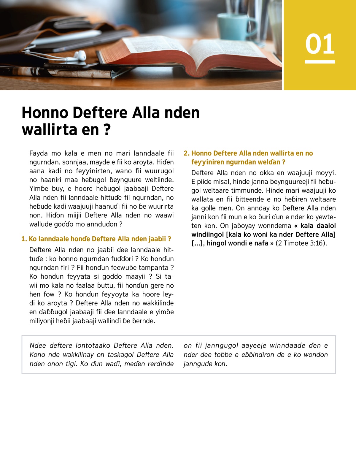 Fayda mo kala e men no mari lanndaale fii ngurndan, sonnjaa, mayde e fii ko aroyta. Hiɗen aana kadi no feƴƴinirten, wano fii wuurugol no haaniri maa heɓugol ɓeynguure weltiinde. Yimɓe buy, e hoore heɓugol jaabaaji Deftere Alla nden fii lanndaale hittuɗe fii ngurndan, no heɓude kadi waajuuji haanuɗi fii no ɓe wuurirta non. Hiɗon miijii Deftere Alla nden no waawi wallude goɗɗo mo annduɗon ?