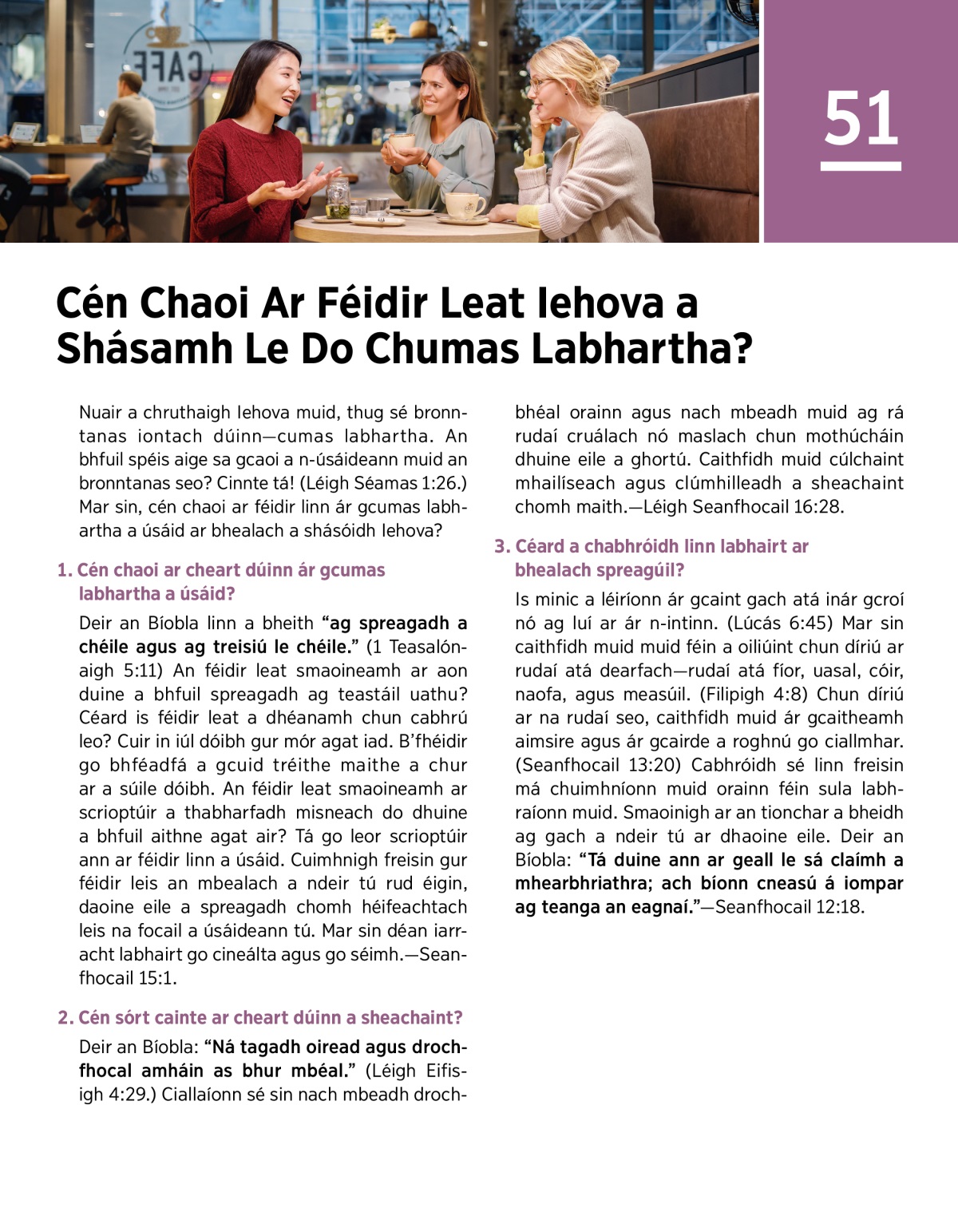 Nuair a chruthaigh Iehova muid, thug sé bronntanas iontach dúinn—cumas labhartha. An bhfuil spéis aige sa gcaoi a n-úsáideann muid an bronntanas seo? Cinnte tá! (Léigh Séamas 1:26.) Mar sin, cén chaoi ar féidir linn ár gcumas labhartha a úsáid ar bhealach a shásóidh Iehova?