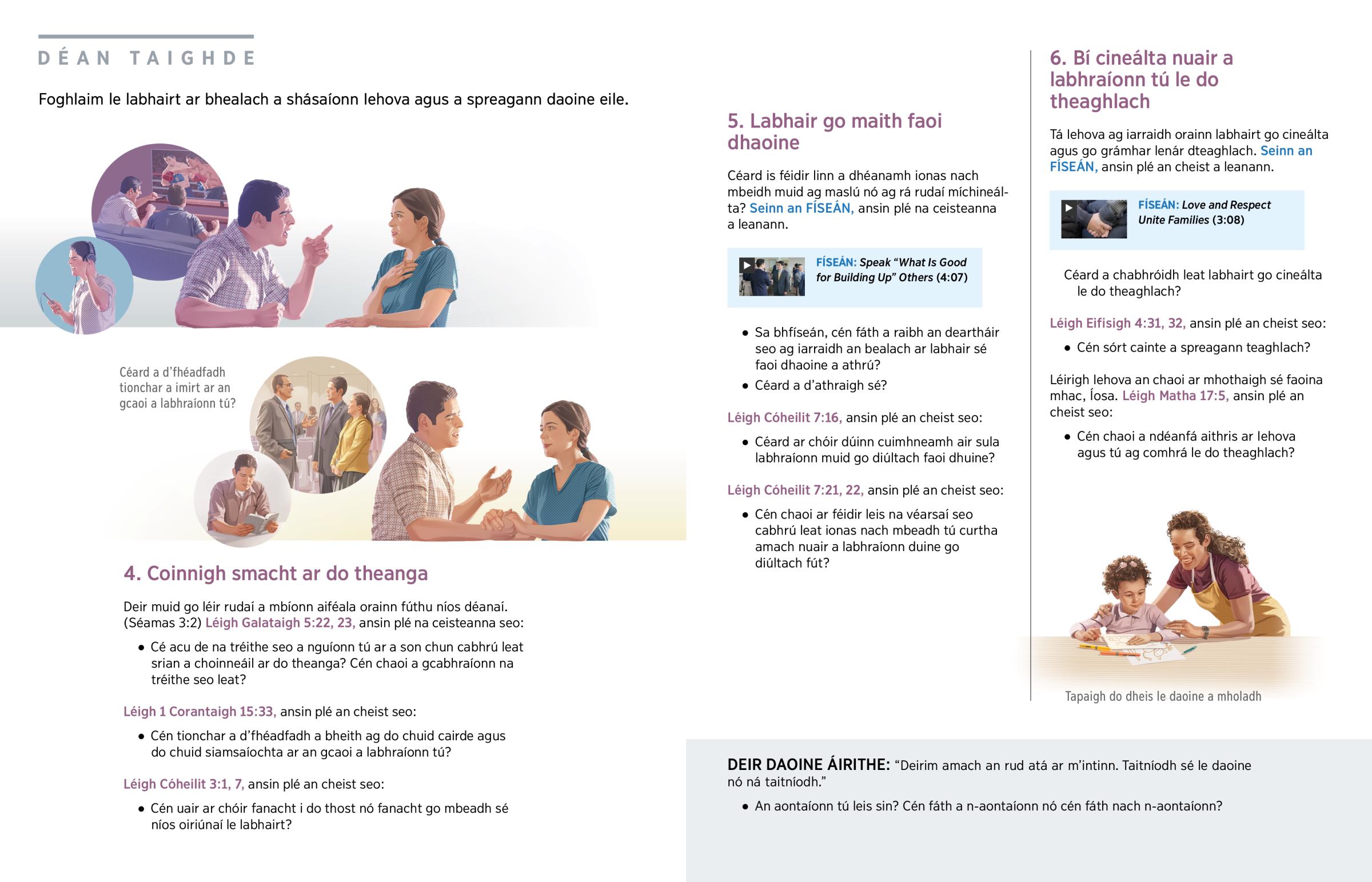 Tá Iehova ag iarraidh orainn labhairt go cineálta agus go grámhar lenár dteaghlach. Seinn an FÍSEÁN, ansin plé an cheist a leanann.