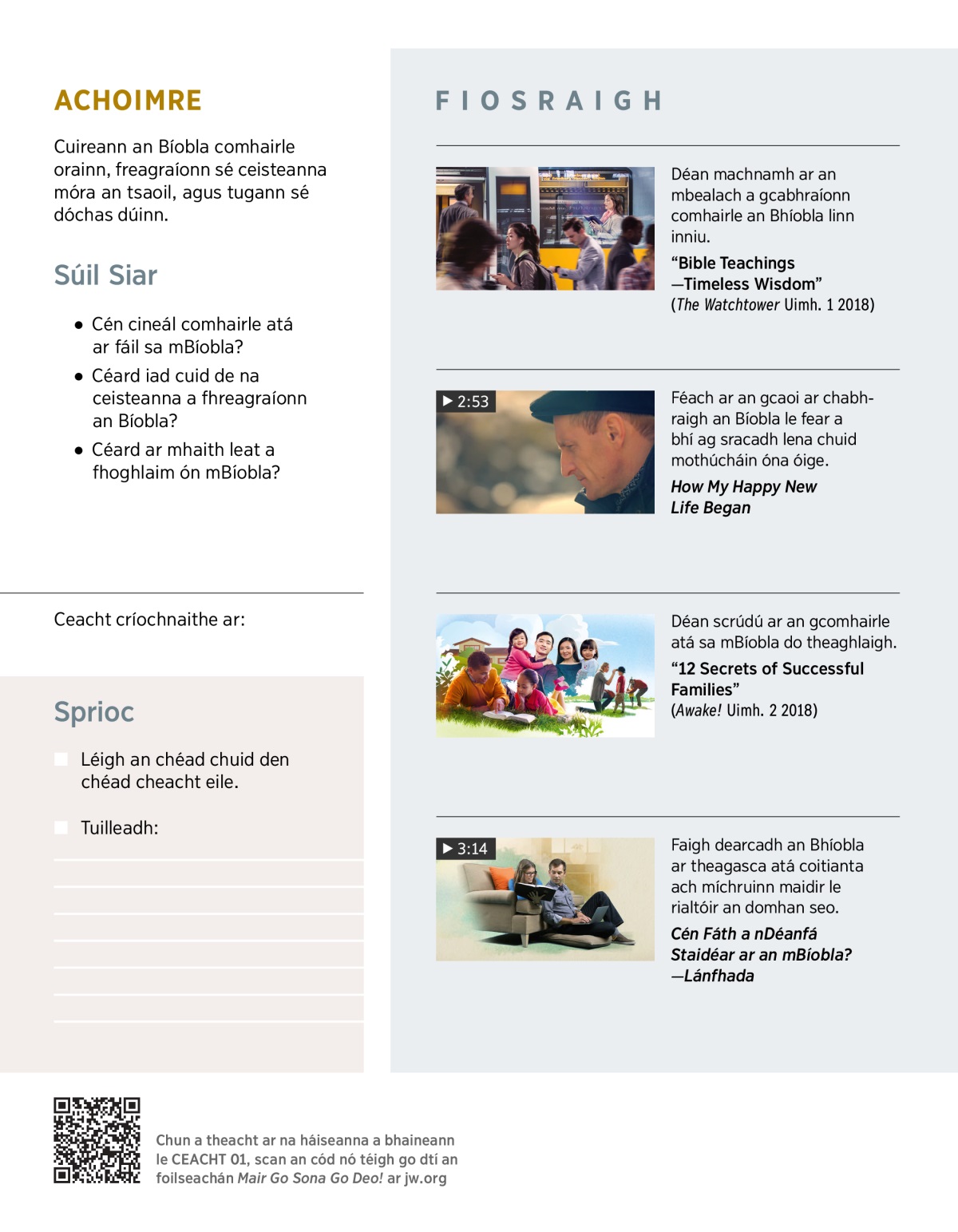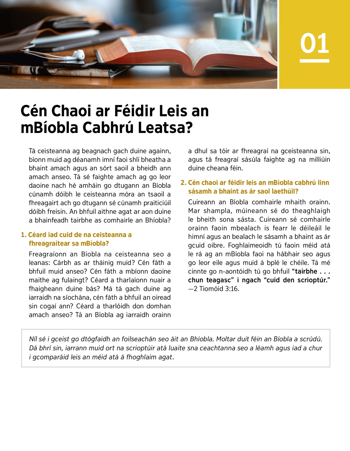 Níl sé i gceist go dtógfaidh an foilseachán seo áit an Bhíobla. Moltar duit féin an Bíobla a scrúdú. Dá bhrí sin, iarrann muid ort na scrioptúir atá luaite sna ceachtanna seo a léamh agus iad a chur i gcomparáid leis an méid atá á fhoghlaim agat.