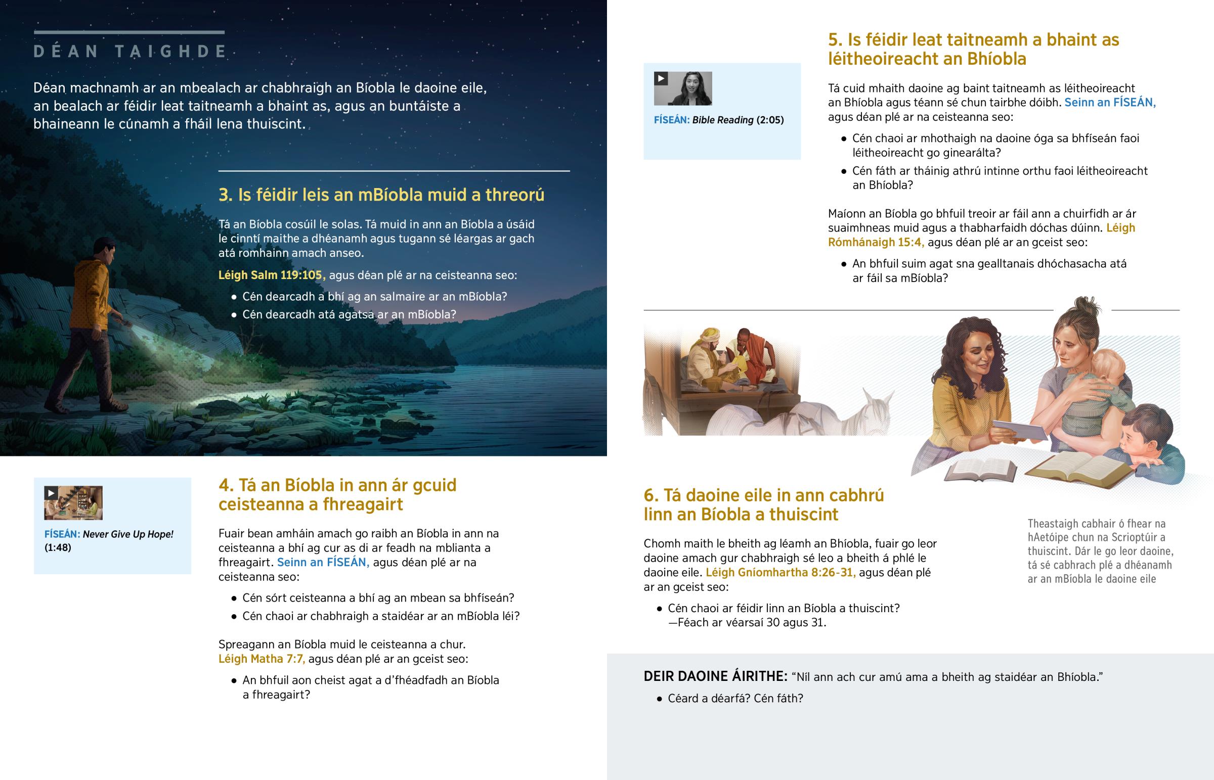 Tá cuid mhaith daoine ag baint taitneamh as léitheoireacht an Bhíobla agus téann sé chun tairbhe dóibh. Seinn an FÍSEÁN, agus déan plé ar na ceisteanna seo: