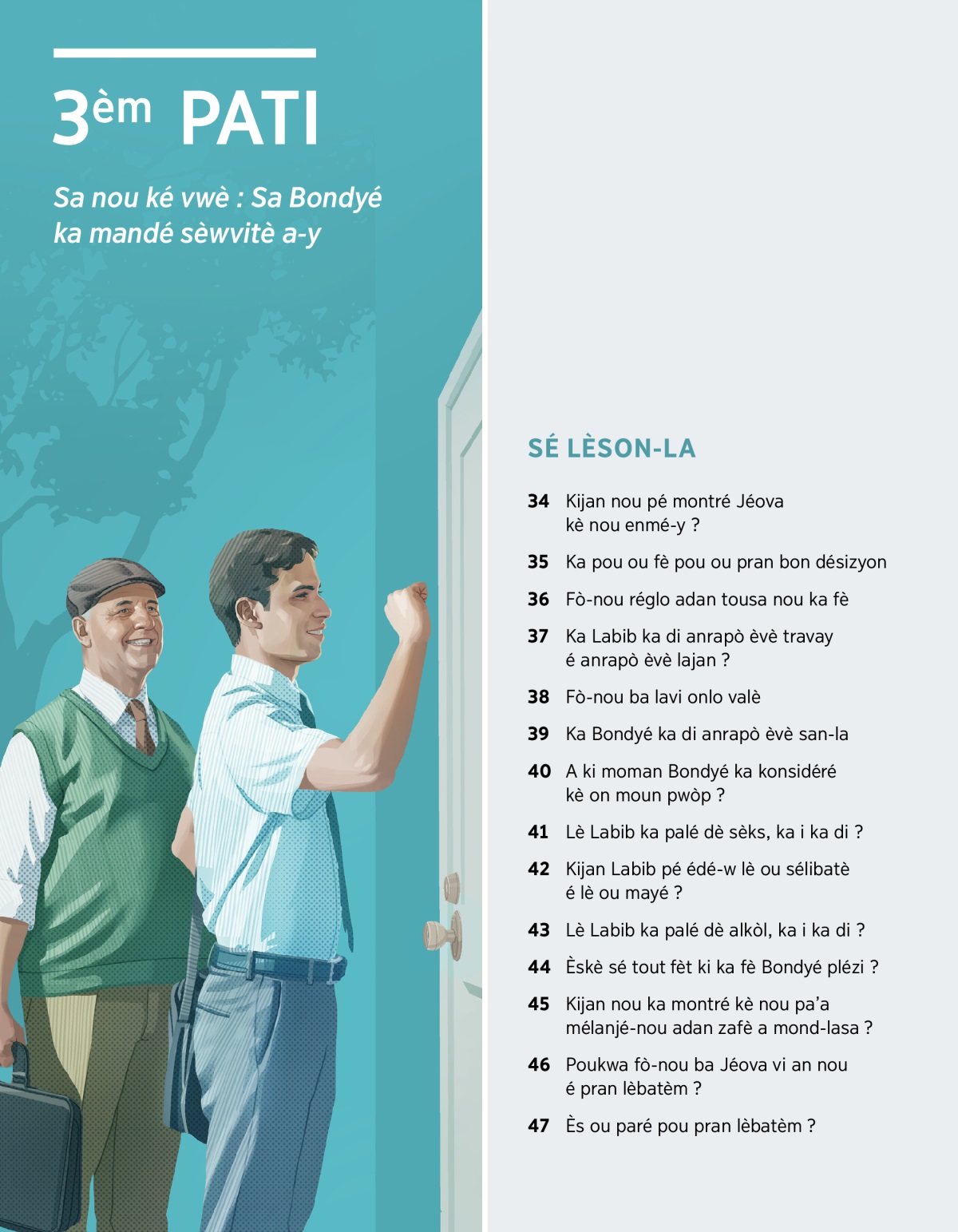 3èm Pati Vèwsyon papyé Sa nou ké vwè : Sa Bondyé ka mandé sèwvitè a-y SÉ LÈSON-LA 34 Kijan nou pé montré Jéova kè nou enmé-y ? 35 Ka pou ou fè pou ou pran bon désizyon 36 Fò-nou réglo adan tousa nou ka fè 37 Ka Labib ka di anrapò èvè travay é anrapò èvè lajan ? 38 Fò-nou ba lavi onlo valè 39 Ka Bondyé ka di anrapò èvè san-la 40 A ki moman Bondyé ka konsidéré kè on moun pwòp ? 41 Lè Labib ka palé dè sèks, ka i ka di ? 42 Kijan Labib pé édé-w lè ou sélibatè é lè ou mayé ? 43 Lè Labib ka palé dè alkòl, ka i ka di ? 44 Èskè sé tout fèt ki ka fè Bondyé plézi ? 45 Kijan nou ka montré kè nou pa’a mélanjé-nou adan zafè a mond-lasa ? 46 Poukwa fò-nou ba Jéova vi an nou é pran lèbatèm ? 47 Ès ou paré pou pran lèbatèm ?