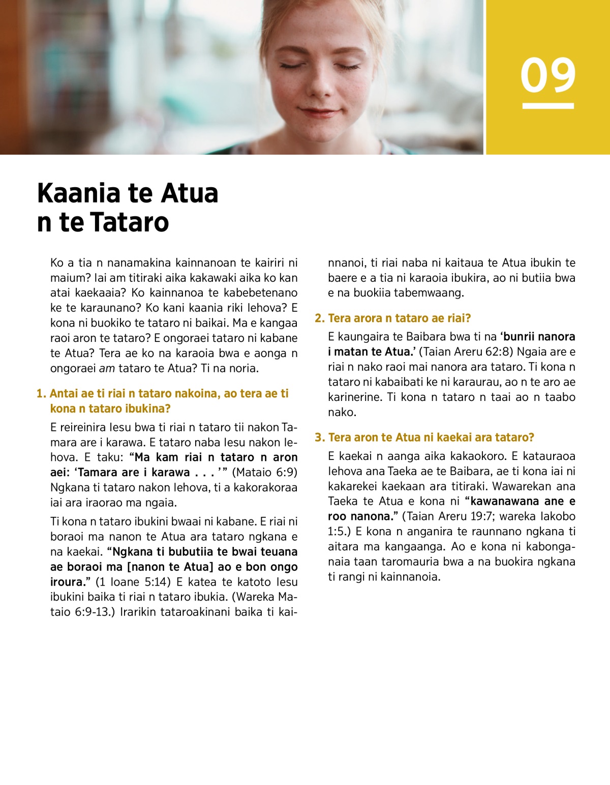 Ko a tia n nanamakina kainnanoan te kairiri ni maium? Iai am titiraki aika kakawaki aika ko kan atai kaekaaia? Ko kainnanoa te kabebetenano ke te karaunano? Ko kani kaania riki Iehova? E kona ni buokiko te tataro ni baikai. Ma e kangaa raoi aron te tataro? E ongoraei tataro ni kabane te Atua? Tera ae ko na karaoia bwa e aonga n ongoraei am tataro te Atua? Ti na noria.