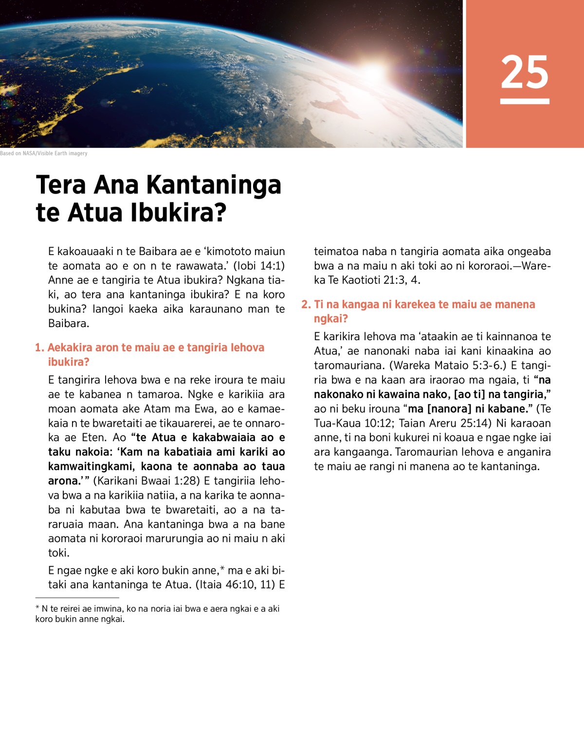 Nora aron ana tangira ae bati Iehova ngke e katauraoa te aonnaba aei ibukira, ao te bae taekinaki n ana Taeka ibukini manenan te maiu aei.