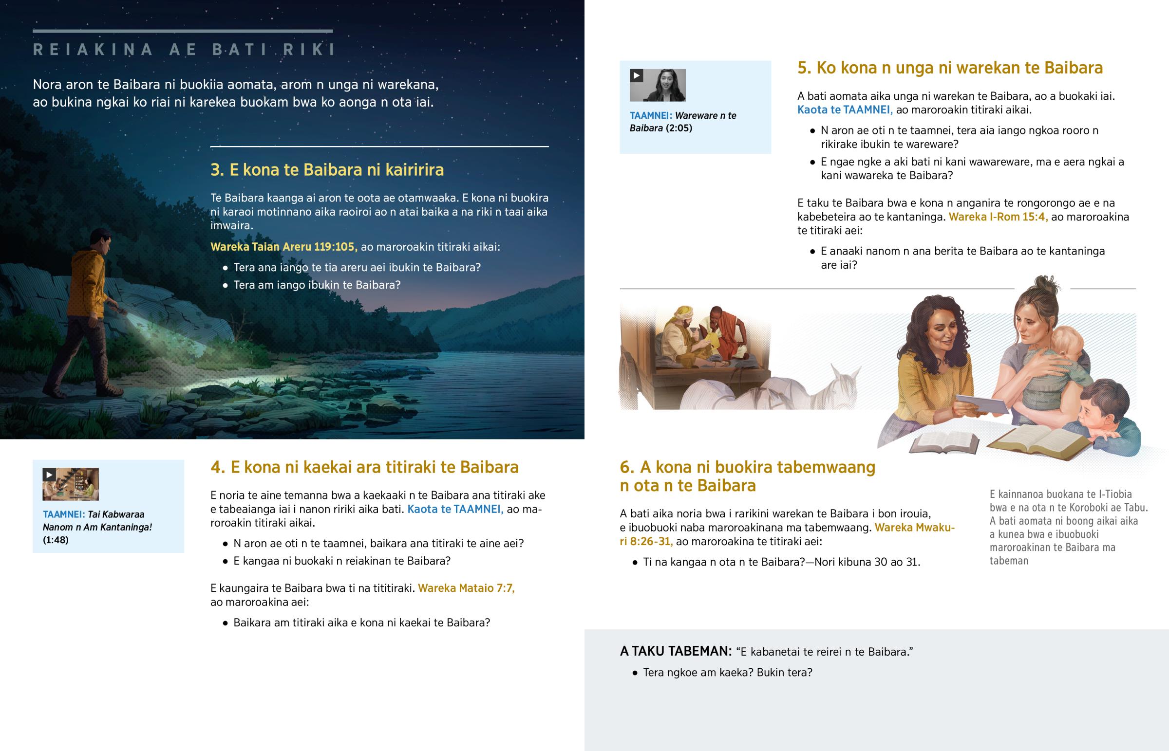 E anganira te taeka n reirei te Baibara. N te katoto, e reiakinia utu aroia ni kukurei ni koaua. E tuangira arora ae riai ngkana ti rawawata ao arora ni kimwareirei n ara mwakuri ni kareketianti. Ko na reiakini ana reirei te Baibara ibukin titiraki aikai ao aika bati riki ngkana ti rinanon te boki aei. Ane ko na kakoauaa ae “te Koroboki ae Tabu ni kabane [kanoan te Baibara a] . . . manena.”—2 Timoteo 3:16.