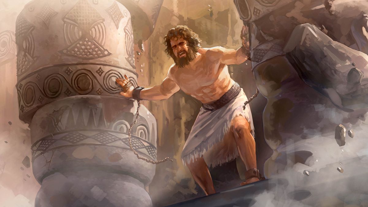 Umi filisteo ojagarra omombaʼapo pohýi Sansónpe ha omoĩ chupe omolina hag̃ua semílla. Haʼekuéra ovyʼa syry, pórke koʼág̃a Sansón haʼe peteĩ esklávontema oñeñapytĩva kadénape. Upéi oorganisa hikuái peteĩ fiésta Dagón rérape ha hetaiterei hénte ijaty itemplopekuéra. Pe terrásapente voi oĩ kuri amo 3.000 persónarupi. Upéi umi filisteo omanda tojegueru Sansónpe ojediverti hag̃ua hikuái hese. Sansón ou ha oñemoĩ chupe oĩháme umi mokõi kolúmna guasu. Upérõ g̃uarã, Sansón oñarrepentíma kuri ha la iñakãrangue okakuaa jeýma avei chupe.