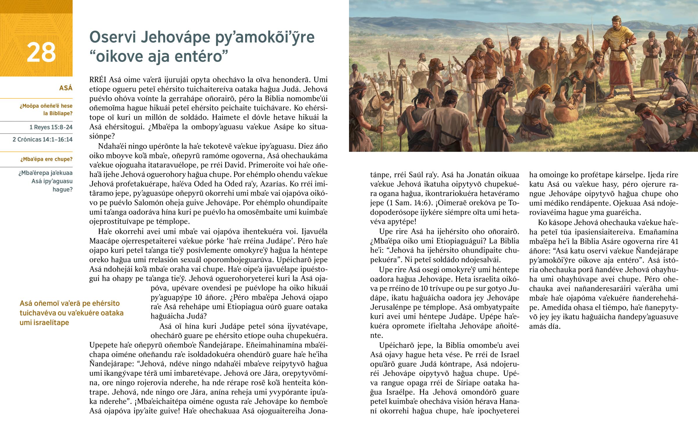 Ndahaʼéi ningo upérõnte la haʼe tekotevẽ vaʼekue ipyʼaguasu. Diez áño oiko mboyve koʼã mbaʼe, oñepyrũ ramóme ogoverna, Asá ohechaukáma vaʼekue ojoguaha itataravuélope, pe rréi David. Primeroite voi haʼe oñehaʼã ijehe Jehová oguerohory hag̃ua chupe. Por ehémplo ohendu vaʼekue Jehová profetakuérape, haʼéva Oded ha Oded raʼy, Azarías. Ko rréi imitãramo jepe, pyʼaguasúpe oñepyrũ okorrehi umi mbaʼe vai ojapóva oikóvo pe puévlo Salomón oheja guive Jehovápe. Por ehémplo ohundipaite umi taʼanga oadoráva hína kuri pe puévlo ha omosẽmbaite umi kuimbaʼe ojeprostituívape pe témplope.