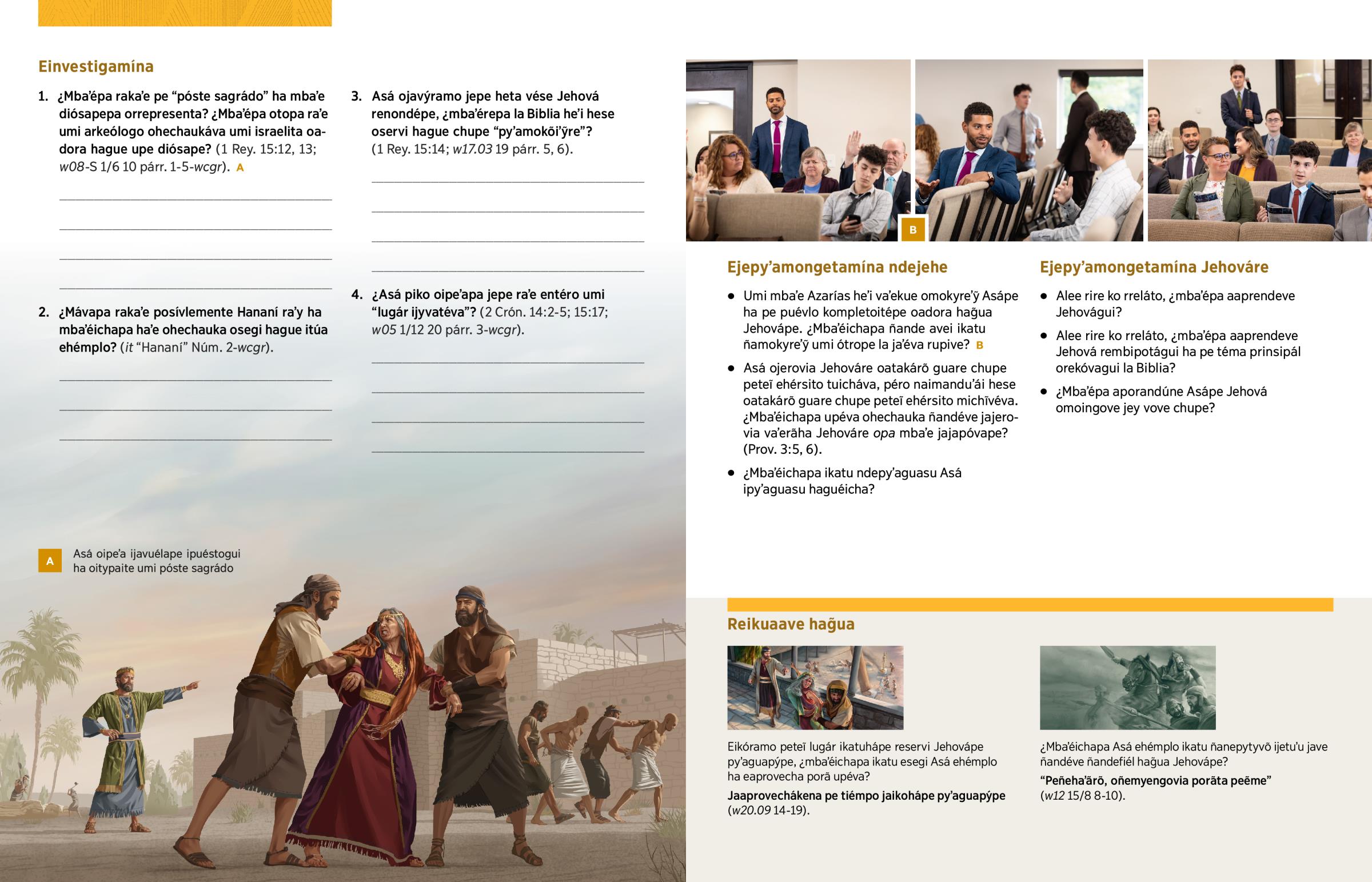 Umi mbaʼe Azarías heʼi vaʼekue omokyreʼỹ Asápe ha pe puévlo kompletoitépe oadora hag̃ua Jehovápe. ¿Mbaʼéichapa ñande avei ikatu ñamokyreʼỹ umi ótrope la jaʼéva rupive? B