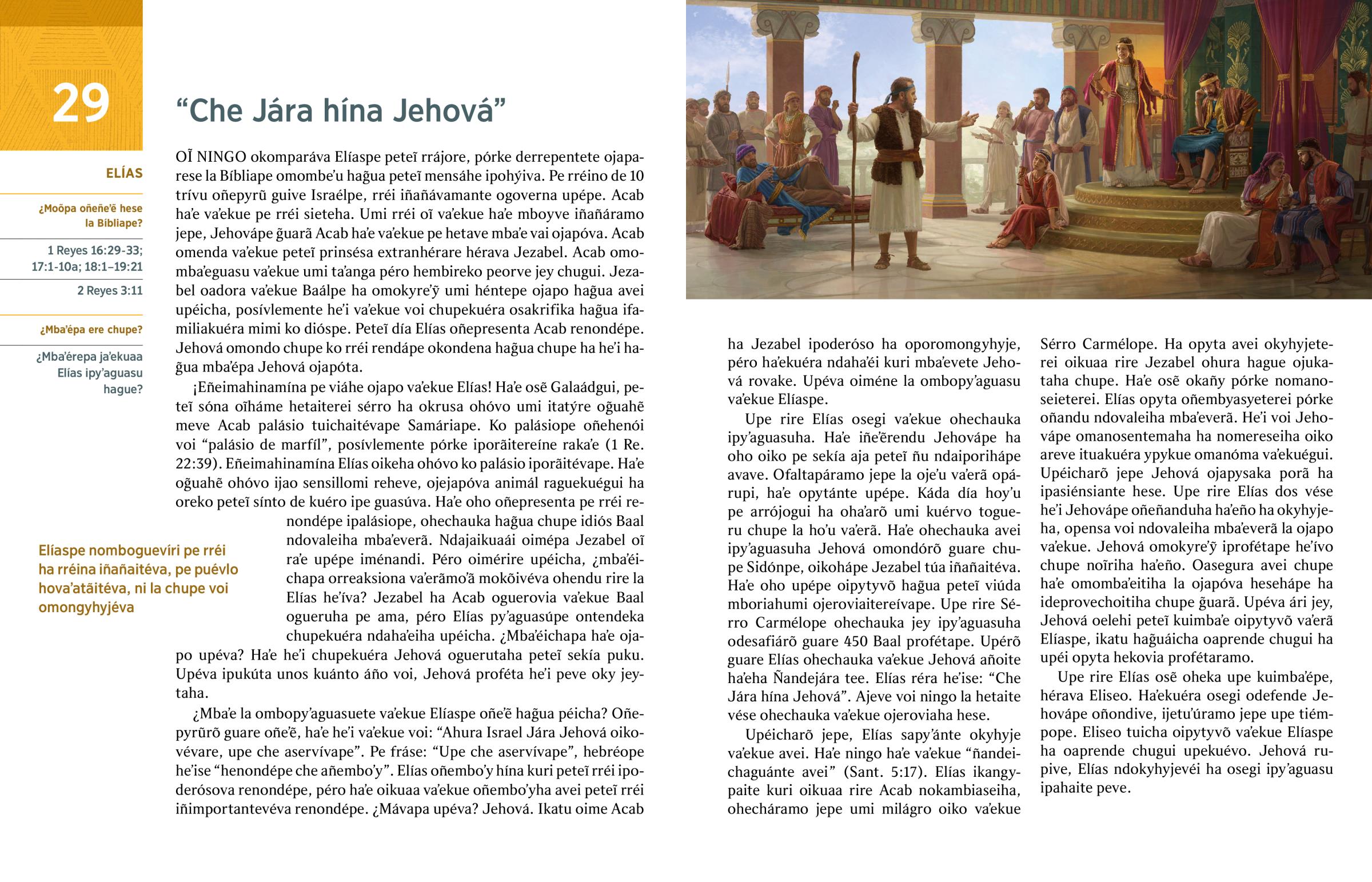 Upe rire Elías osegi vaʼekue ohechauka ipyʼaguasuha. Haʼe iñeʼẽrendu Jehovápe ha oho oiko pe sekía aja peteĩ ñu ndaiporihápe avave. Ofaltapáramo jepe la ojeʼu vaʼerã opárupi, haʼe opytánte upépe. Káda día hoyʼu pe arrójogui ha ohaʼarõ umi kuérvo togueru chupe la hoʼu vaʼerã. Haʼe ohechauka avei ipyʼaguasuha Jehová omondórõ guare chupe Sidónpe, oikohápe Jezabel túa iñañaitéva. Haʼe oho upépe oipytyvõ hag̃ua peteĩ viúda mboriahumi ojeroviaitereívape. Upe rire Sérro Carmélope ohechauka jey ipyʼaguasuha odesafiárõ guare 450 Baal profétape. Upérõ guare Elías ohechauka vaʼekue Jehová añoite haʼeha Ñandejára tee. Elías réra heʼise: “Che Jára hína Jehová”. Ajeve voi ningo la hetaite vése ohechauka vaʼekue ojeroviaha hese.