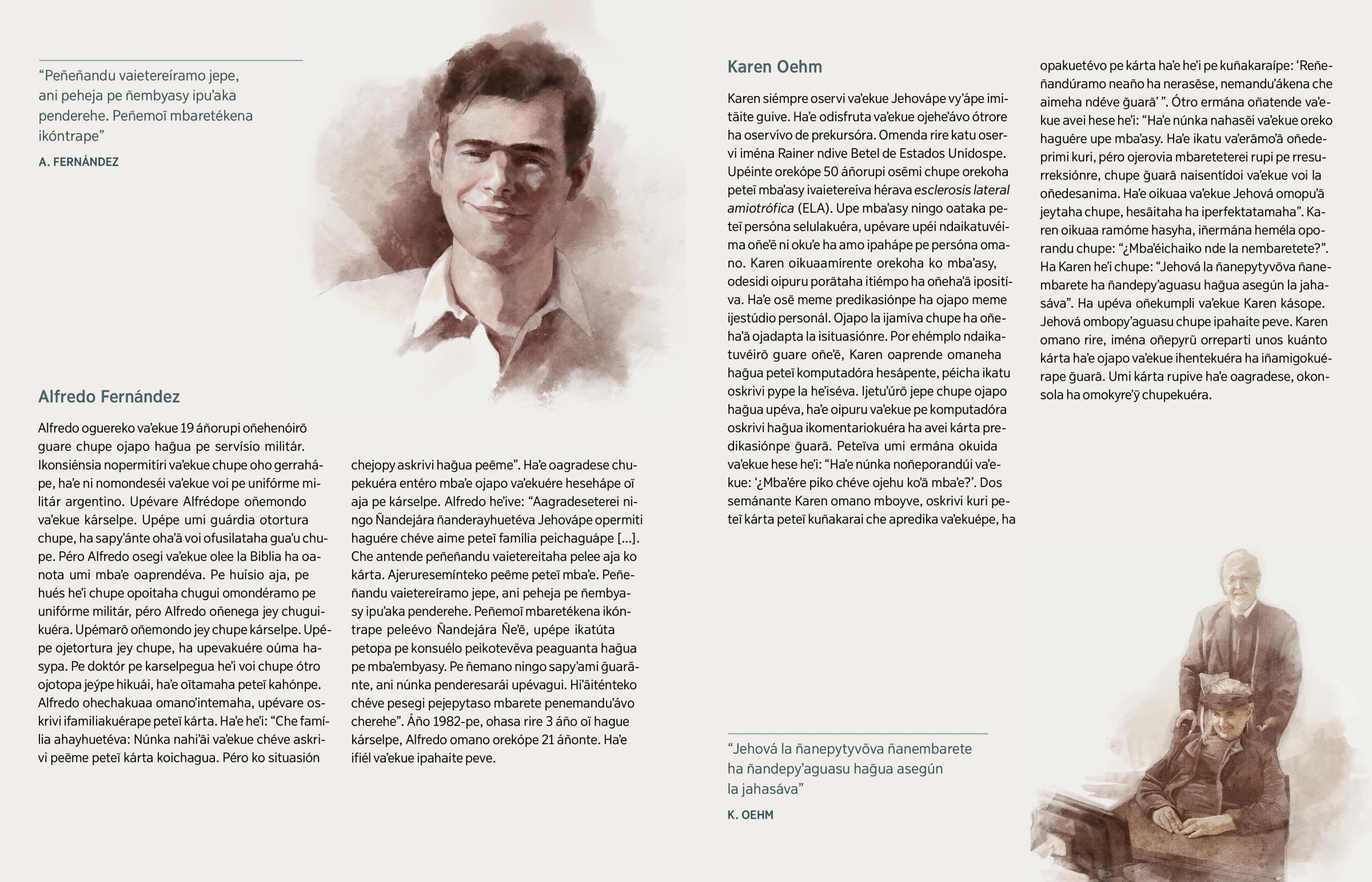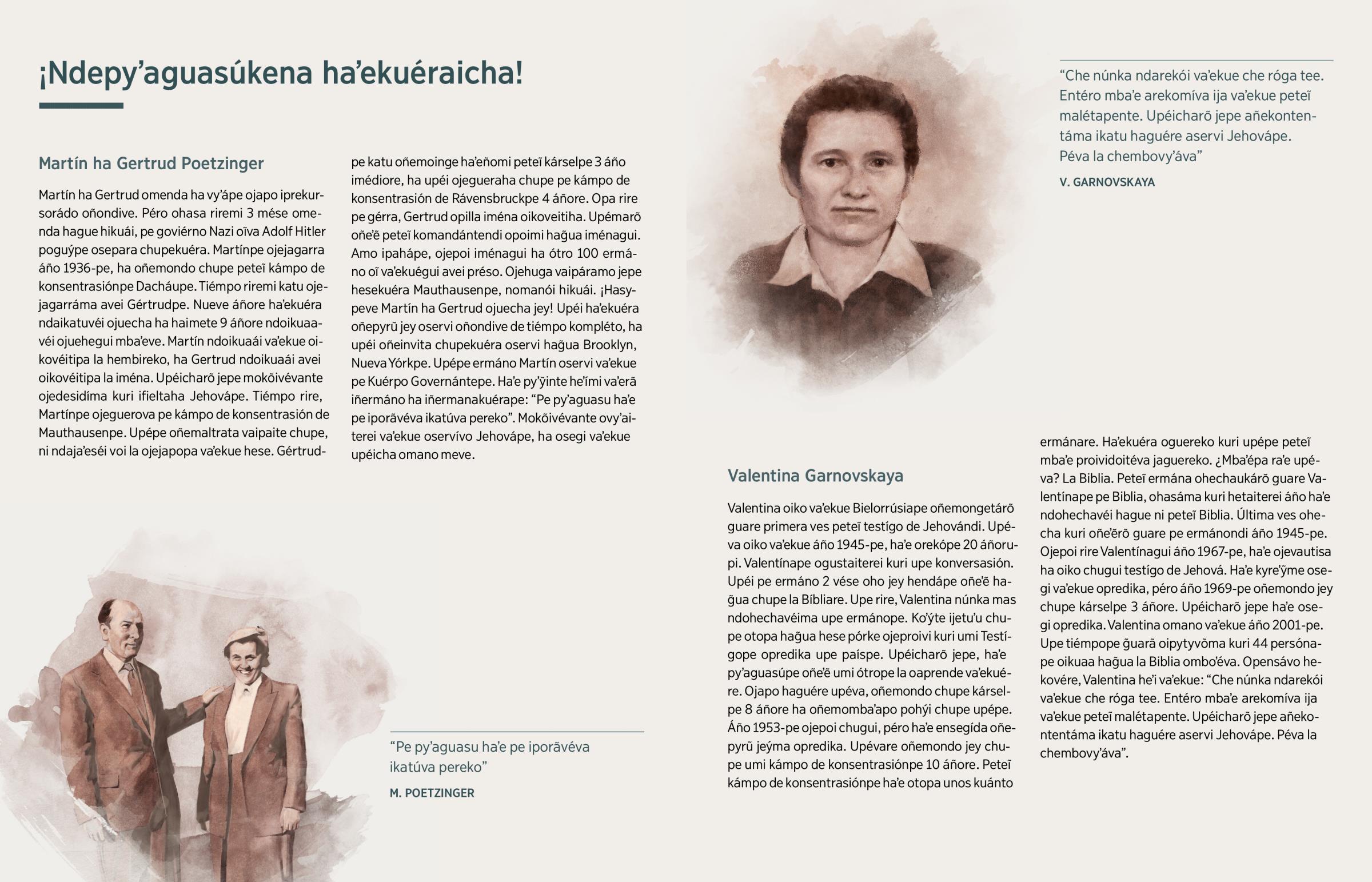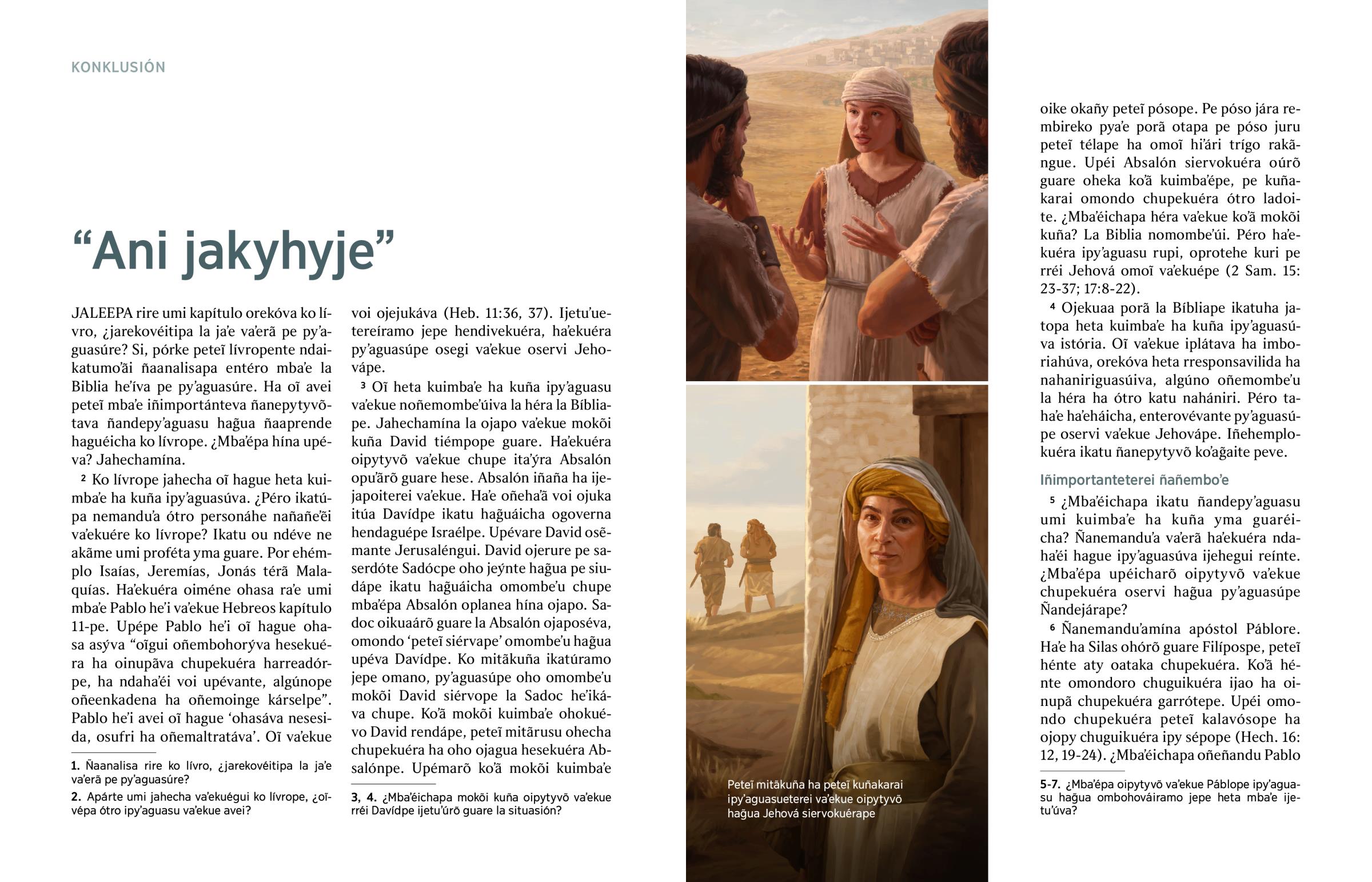 2 Ko lívrope jahecha oĩ hague heta kuimbaʼe ha kuña ipyʼaguasúva. ¿Péro ikatúpa nemanduʼa ótro personáhe nañañeʼẽi vaʼekuére ko lívrope? Ikatu ou ndéve ne akãme umi proféta yma guare. Por ehémplo Isaías, Jeremías, Jonás térã Malaquías. Haʼekuéra oiméne ohasa raʼe umi mbaʼe Pablo heʼi vaʼekue Hebreos kapítulo 11-pe. Upépe Pablo heʼi oĩ hague ohasa asýva “oĩgui oñembohorýva hesekuéra ha oinupãva chupekuéra harreadórpe, ha ndahaʼéi voi upévante, algúnope oñeenkadena ha oñemoinge kárselpe”. Pablo heʼi avei oĩ hague ‘ohasáva nesesida, osufri ha oñemaltratáva’. Oĩ vaʼekue voi ojejukáva (Heb. 11:36, 37). Ijetuʼuetereíramo jepe hendivekuéra, haʼekuéra pyʼaguasúpe osegi vaʼekue oservi Jehovápe.