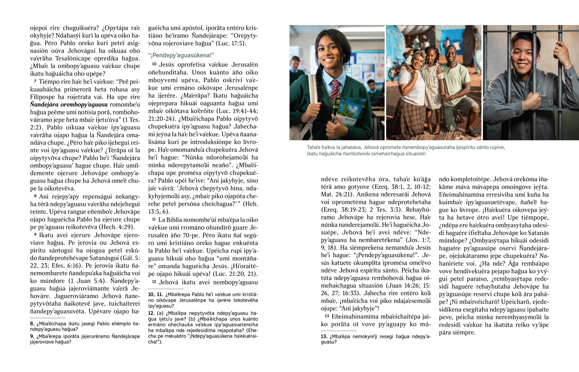 10 Jesús oprofetisa vaʼekue Jerusalén oñehunditaha. Unos kuánto áño oiko mboyvemi upéva, Pablo oskrivi vaʼekue umi ermáno oikóvape Jerusalénpe ha ijerére. ¿Maʼerãpa? Ikatu hag̃uáicha ojeprepara hikuái oaguanta hag̃ua umi mbaʼe oikótava koʼẽrõite (Luc. 19:41-44; 21:20-24). ¿Mbaʼéichapa Pablo oipytyvõ chupekuéra ipyʼaguasu hag̃ua? Jahechami jeýna la haʼe heʼi vaʼekue. Upéva ñaanalisáma kuri pe introduksiónpe ko lívrope. Haʼe omomanduʼa chupekuéra Jehová heʼi hague: “Núnka ndorohejamoʼãi ha núnka nderepytamoʼãi neaño”. ¿Mbaʼéichapa upe promésa oipytyvõ chupekuéra? Pablo upéi heʼive: “Ani jakyhyje, síno jaʼe vaʼerã: ‘Jehová chepytyvõ hína, ndakyhyjemoʼãi asy, ¿mbaʼe piko ojapóta cherehe peteĩ persóna cheichagua?’” (Heb. 13:5, 6).