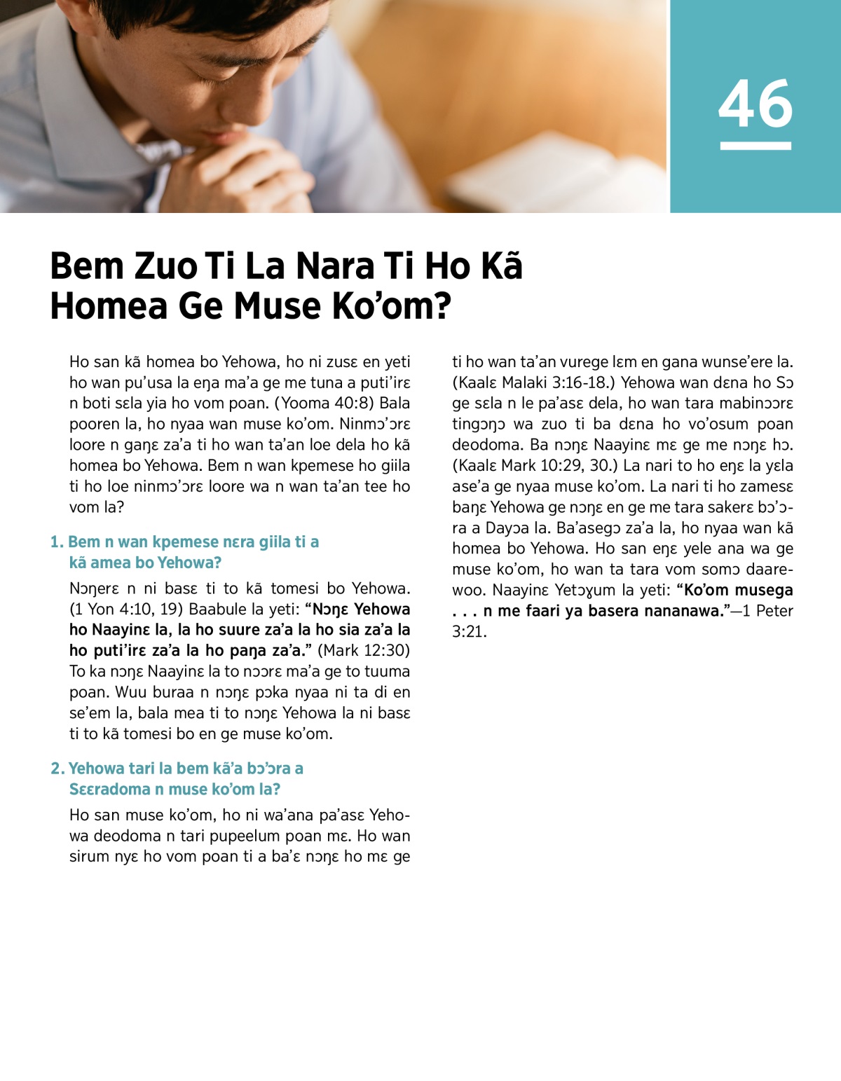 Ho san muse ko’om, ho ni wa’ana pa’asɛ Yehowa deodoma n tari pupeelum poan mɛ. Ho wan sirum nyɛ ho vom poan ti a ba’ɛ nɔŋɛ ho mɛ ge ti ho wan ta’an vurege lɛm en gana wunse’ere la. (Kaalɛ Malaki 3:16-18.) Yehowa wan dɛna ho Sɔ ge sɛla n le pa’asɛ dela, ho wan tara mabinɔɔrɛ tingɔŋɔ wa zuo ti ba dɛna ho vo’osum poan deodoma. Ba nɔŋɛ Naayinɛ mɛ ge me nɔŋɛ hɔ. (Kaalɛ Mark 10:29, 30.) La nari to ho eŋɛ la yɛla ase’a ge nyaa muse ko’om. La nari ti ho zamesɛ baŋɛ Yehowa ge nɔŋɛ en ge me tara sakerɛ bɔ’ɔra a Dayɔa la. Ba’asegɔ za’a la, ho nyaa wan kã homea bo Yehowa. Ho san eŋɛ yele ana wa ge muse ko’om, ho wan ta tara vom somɔ daarewoo. Naayinɛ Yetɔɣum la yeti: “Ko’om musega . . . n me faari ya basera nananawa.”—1 Peter 3:21.