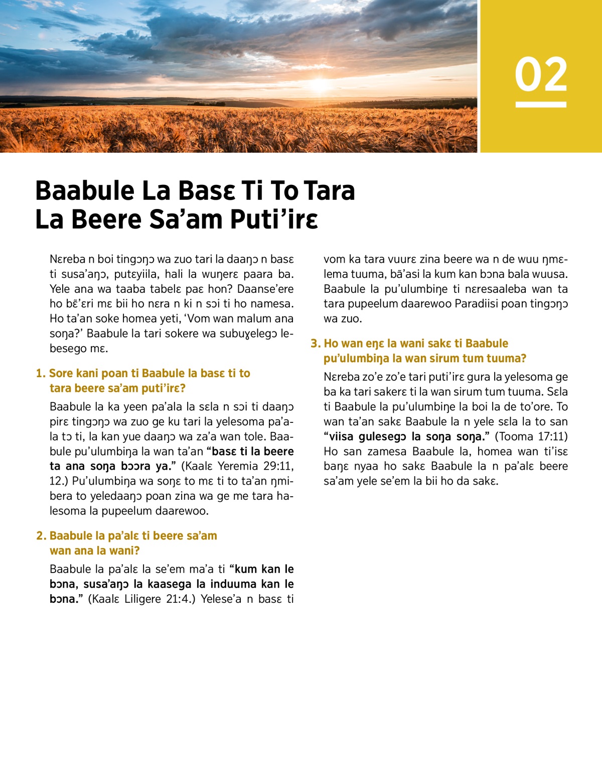 Baabule la ka yeen pa’ala la sɛla n sɔi ti daaŋɔ pirɛ tingɔŋɔ wa zuo ge ku tari la yelesoma pa’ala tɔ ti, la kan yue daaŋɔ wa za’a wan tole. Baabule pu’ulumbiŋa la wan ta’an “basɛ ti la beere ta ana soŋa bɔɔra ya.” (Kaalɛ Yeremia 29:​11, 12.) Pu’ulumbiŋa wa soŋɛ to mɛ ti to ta’an ŋmibera to yeledaaŋɔ poan zina wa ge me tara halesoma la pupeelum daarewoo.