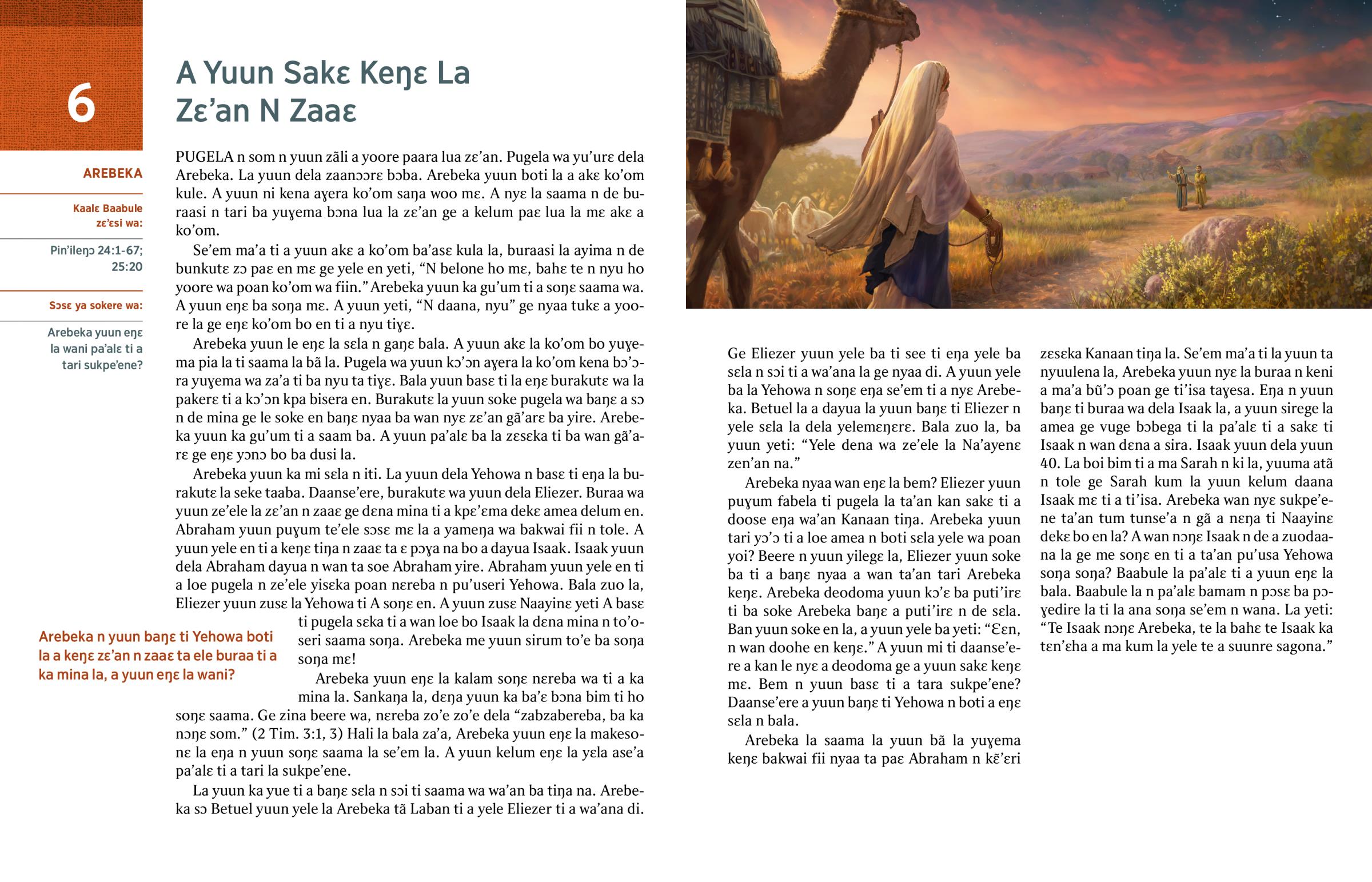 Arebeka nyaa wan eŋɛ la bem? Eliezer yuun puɣum fabela ti pugela la ta’an kan sakɛ ti a doose eŋa wa’an Kanaan tiŋa. Arebeka yuun tari yɔ’ɔ ti a loe amea n boti sɛla yele wa poan yoi? Beere n yuun yilegɛ la, Eliezer yuun soke ba ti a baŋɛ nyaa a wan ta’an tari Arebeka keŋɛ. Arebeka deodoma yuun kɔ’ɛ ba puti’irɛ ti ba soke Arebeka baŋɛ a puti’irɛ n de sɛla. Ban yuun soke en la, a yuun yele ba yeti: “Ɛɛn, n wan doohe en keŋɛ.” A yuun mi ti daanse’ere a kan le nyɛ a deodoma ge a yuun sakɛ keŋɛ mɛ. Bem n yuun basɛ ti a tara sukpe’ene? Daanse’ere a yuun baŋɛ ti Yehowa n boti a eŋɛ sɛla n bala.