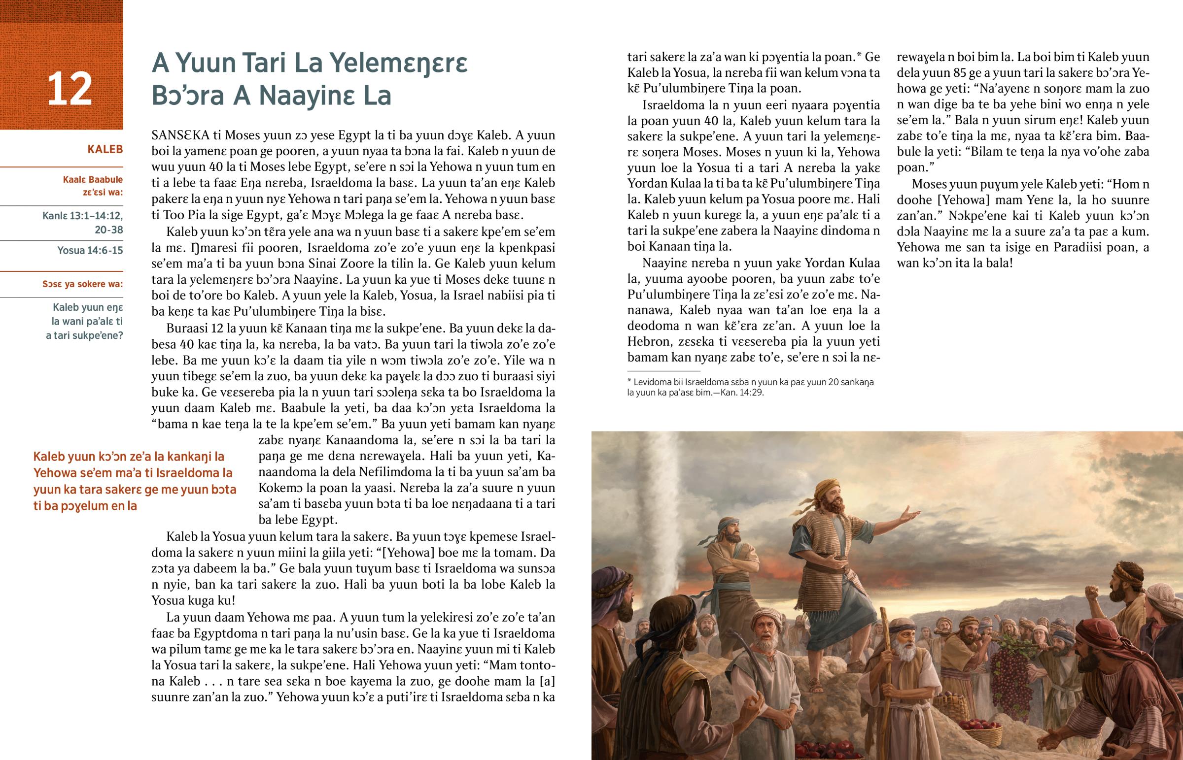 La yuun daam Yehowa mɛ paa. A yuun tum la yelekiresi zo’e zo’e ta’an faaɛ ba Egyptdoma n tari paŋa la nu’usin basɛ. Ge la ka yue ti Israeldoma wa pilum tamɛ ge me ka le tara sakerɛ bɔ’ɔra en. Naayinɛ yuun mi ti Kaleb la Yosua tari la sakerɛ, la sukpe’ene. Hali Yehowa yuun yeti: “Mam tontona Kaleb . . . n tare sea sɛka n boe kayema la zuo, ge doohe mam la [a] suunre zan’an la zuo.” Yehowa yuun kɔ’ɛ a puti’irɛ ti Israeldoma sɛba n ka tari sakerɛ la za’a wan ki pɔɣentia la poan.a Ge Kaleb la Yosua, la nɛreba fii wan kelum vɔna ta kɛ̃ Pu’ulumbiŋere Tiŋa la poan.