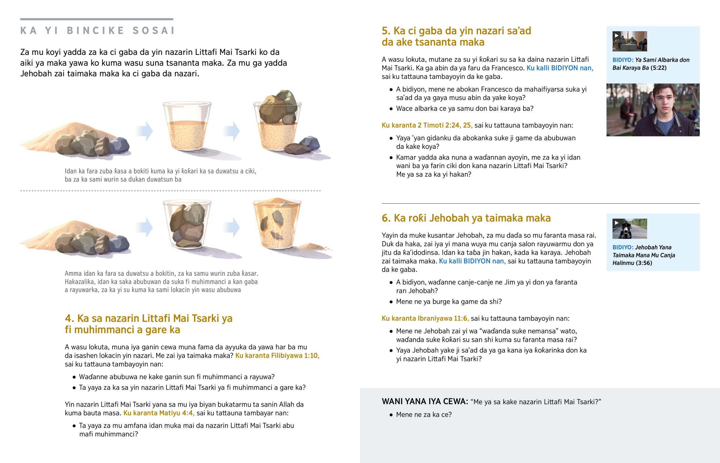 Amma idan ka fara sa duwatsu a bokitin, za ka samu wurin zuba ƙasar. Hakazalika, idan ka saka abubuwan da suka fi muhimmanci a kan gaba a rayuwarka, za ka yi su kuma ka sami lokacin yin wasu abubuwa