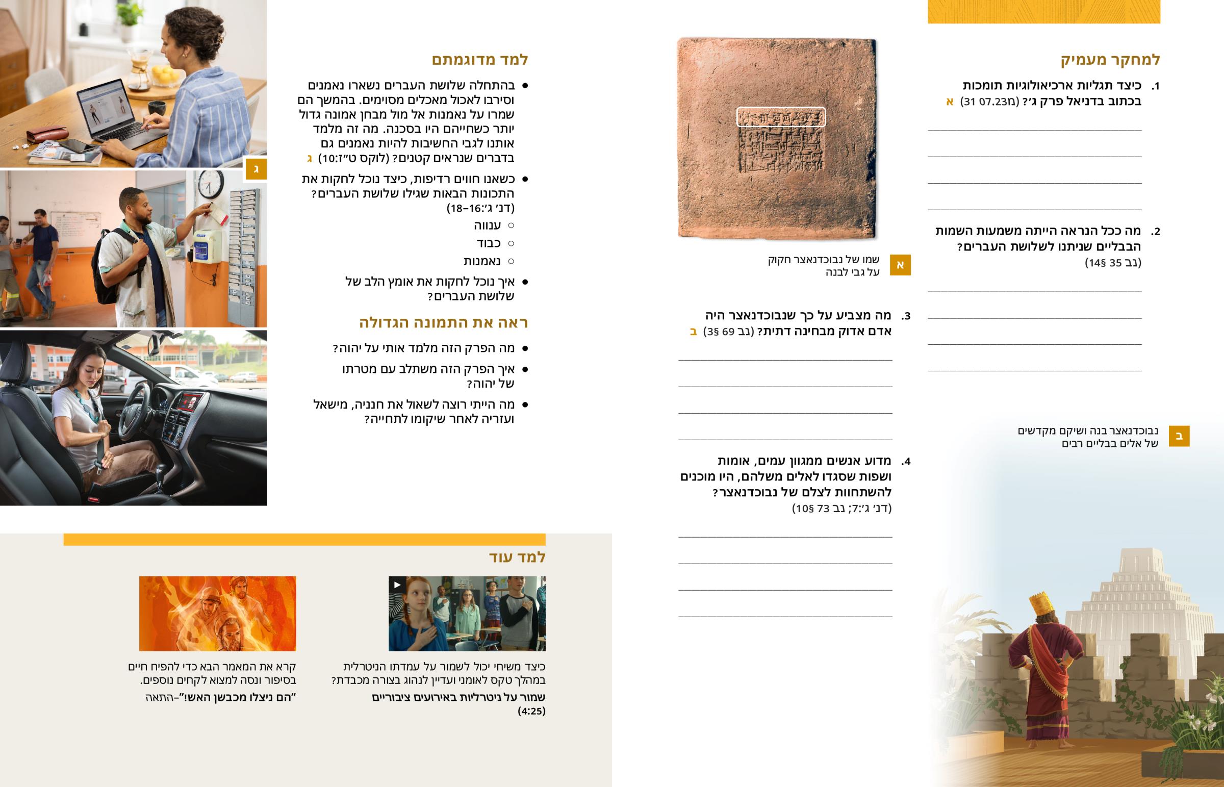 בהתחלה שלושת העברים נשארו נאמנים וסירבו לאכול מאכלים מסוימים. בהמשך הם שמרו על נאמנות אל מול מבחן אמונה גדול יותר כשחייהם היו בסכנה. מה זה מלמד אותנו לגבי החשיבות להיות נאמנים גם בדברים שנראים קטנים? (לוקס ט״ז:10) ג