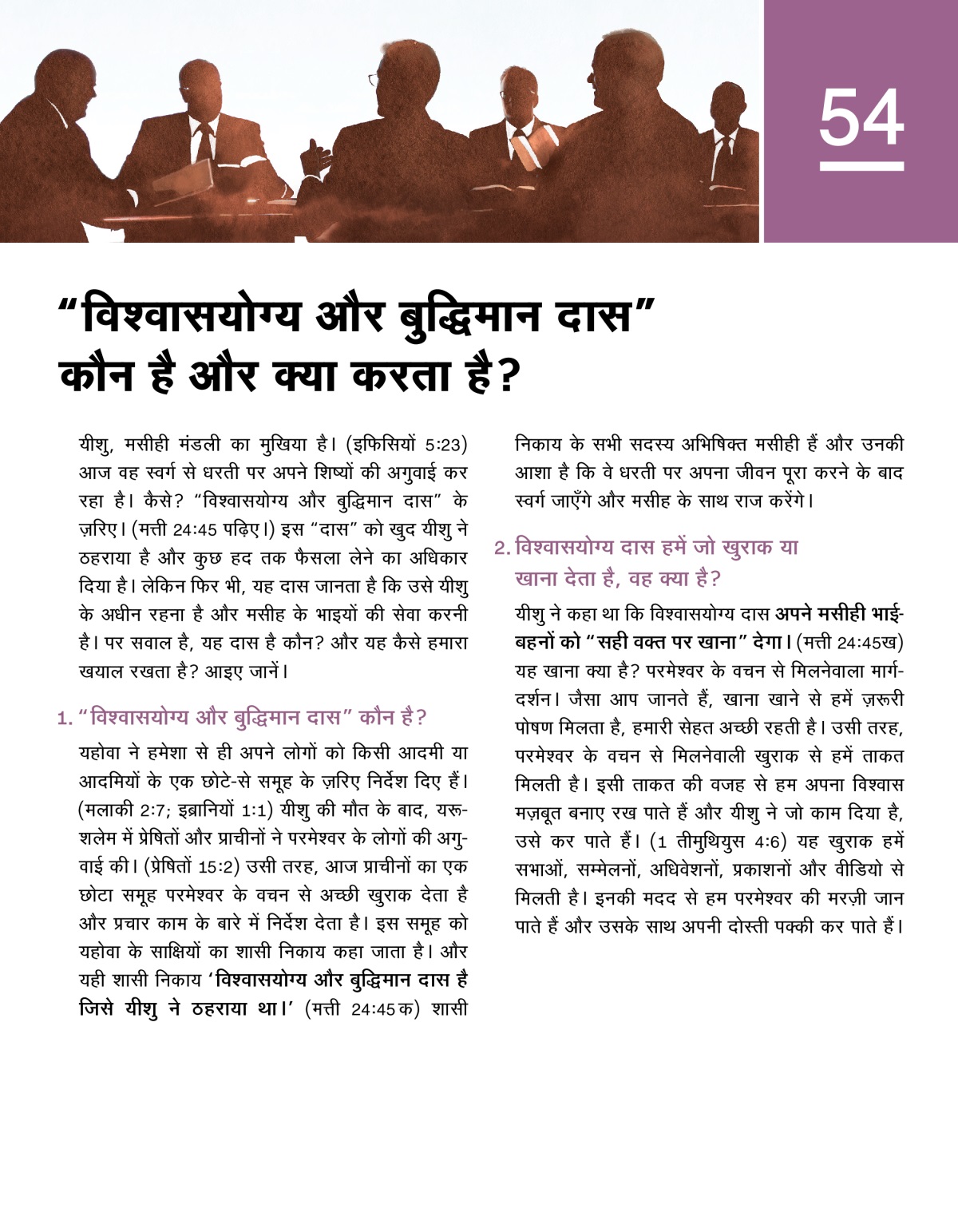 यीशु, मसीही मंडली का मुखिया है। (इफिसियों 5:23) आज वह स्वर्ग से धरती पर अपने शिष्यों की अगुवाई कर रहा है। कैसे? “विश्वासयोग्य और बुद्धिमान दास” के ज़रिए। (मत्ती 24:45 पढ़िए।) इस “दास” को खुद यीशु ने ठहराया है और कुछ हद तक फैसला लेने का अधिकार दिया है। लेकिन फिर भी, यह दास जानता है कि उसे यीशु के अधीन रहना है और मसीह के भाइयों की सेवा करनी है। पर सवाल है, यह दास है कौन? और यह कैसे हमारा खयाल रखता है? आइए जानें।