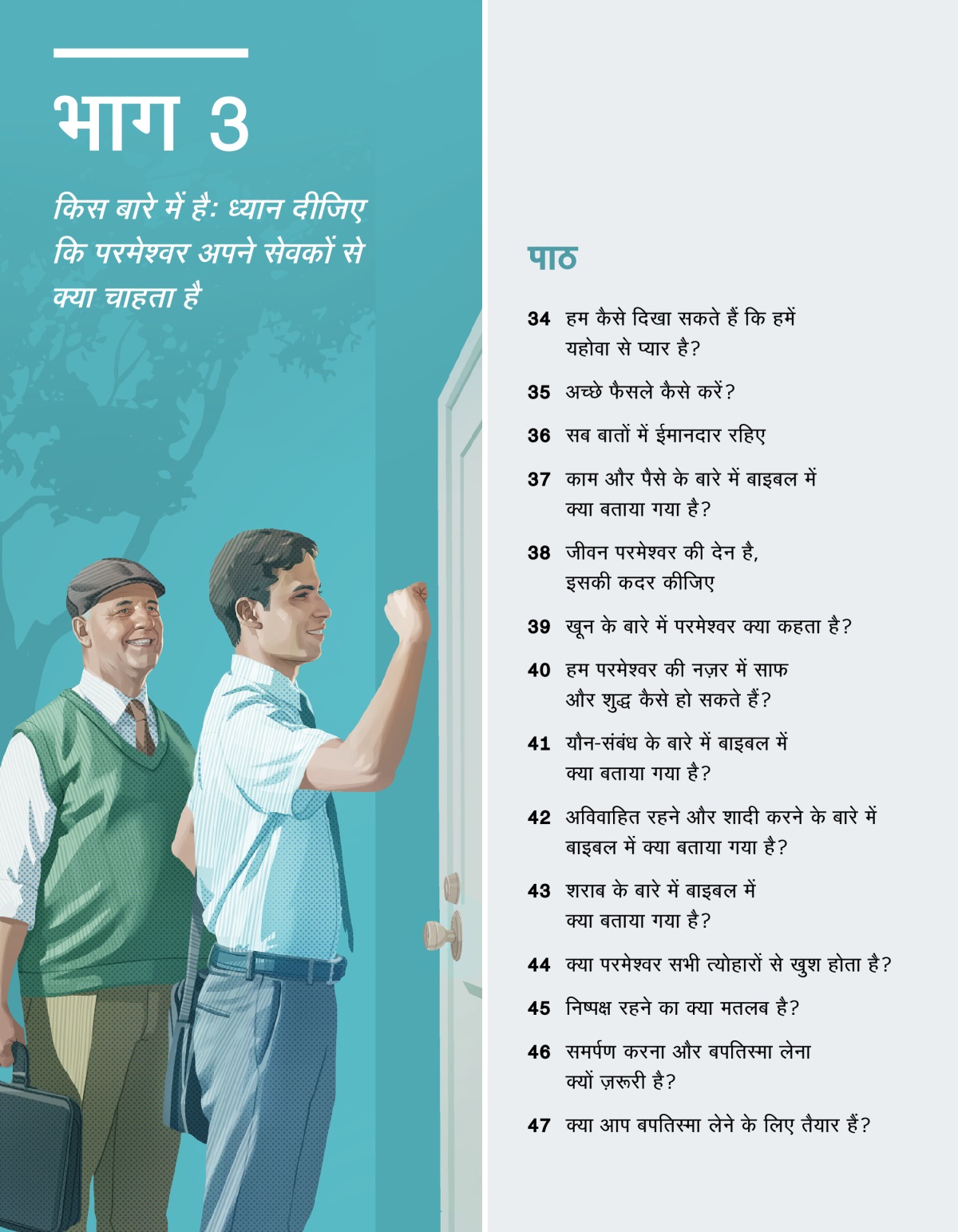 भाग 3 छपा हुआ संस्करण किस बारे में है: ध्यान दीजिए कि परमेश्वर अपने सेवकों से क्या चाहता है पाठ 34 हम कैसे दिखा सकते हैं कि हमें यहोवा से प्यार है? 35 अच्छे फैसले कैसे करें? 36 सब बातों में ईमानदार रहिए 37 काम और पैसे के बारे में बाइबल में क्या बताया गया है? 38 जीवन परमेश्वर की देन है, इसकी कदर कीजिए 39 खून के बारे में परमेश्वर क्या कहता है? 40 हम परमेश्वर की नज़र में साफ और शुद्ध कैसे हो सकते हैं? 41 यौन-संबंध के बारे में बाइबल में क्या बताया गया है? 42 अविवाहित रहने और शादी करने के बारे में बाइबल में क्या बताया गया है? 43 शराब के बारे में बाइबल में क्या बताया गया है? 44 क्या परमेश्वर सभी त्योहारों से खुश होता है? 45 निष्पक्ष रहने का क्या मतलब है? 46 समर्पण करना और बपतिस्मा लेना क्यों ज़रूरी है? 47 क्या आप बपतिस्मा लेने के लिए तैयार हैं?