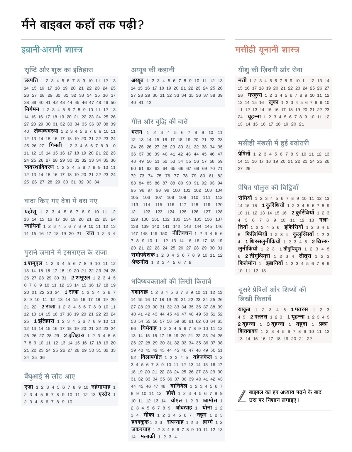 मैंने बाइबल कहाँ तक पढ़ी? छपा हुआ संस्करण सृष्टि और शुरू का इतिहास वादा किए गए देश में बस गए पुराने ज़माने में इसराएल के राजा बँधुआई से लौट आए अय्यूब की कहानी गीत और बुद्धि की बातें भविष्यवक्ताओं की लिखी किताबें यीशु की ज़िंदगी और सेवा मसीही मंडली में हुई बढ़ोतरी प्रेषित पौलुस की चिट्ठियाँ दूसरे प्रेषितों और शिष्यों की लिखी किताबें बाइबल का हर अध्याय पढ़ने के बाद उस पर निशान लगाइए। इब्रानी-अरामी शास्त्र सृष्टि और शुरू का इतिहास उत्पत्ति 1 2 3 4 5 6 7 8 9 10 11 12 13 14 15 16 17 18 19 20 21 22 23 24 25 26 27 28 29 30 31 32 33 34 35 36 37 38 39 40 41 42 43 44 45 46 47 48 49 50 निर्गमन 1 2 3 4 5 6 7 8 9 10 11 12 13 14 15 16 17 18 19 20 21 22 23 24 25 26 27 28 29 30 31 32 33 34 35 36 37 38 39 40 लैव्यव्यवस्था 1 2 3 4 5 6 7 8 9 10 11 12 13 14 15 16 17 18 19 20 21 22 23 24 25 26 27 गिनती 1 2 3 4 5 6 7 8 9 10 11 12 13 14 15 16 17 18 19 20 21 22 23 24 25 26 27 28 29 30 31 32 33 34 35 36 व्यवस्थाविवरण 1 2 3 4 5 6 7 8 9 10 11 12 13 14 15 16 17 18 19 20 21 22 23 24 25 26 27 28 29 30 31 32 33 34 वादा किए गए देश में बस गए यहोशू 1 2 3 4 5 6 7 8 9 10 11 12 13 14 15 16 17 18 19 20 21 22 23 24 न्यायियों 1 2 3 4 5 6 7 8 9 10 11 12 13 14 15 16 17 18 19 20 21 रूत 1 2 3 4 पुराने ज़माने में इसराएल के राजा 1 शमूएल 1 2 3 4 5 6 7 8 9 10 11 12 13 14 15 16 17 18 19 20 21 22 23 24 25 26 27 28 29 30 31 2 शमूएल 1 2 3 4 5 6 7 8 9 10 11 12 13 14 15 16 17 18 19 20 21 22 23 24 1 राजा 1 2 3 4 5 6 7 8 9 10 11 12 13 14 15 16 17 18 19 20 21 22 2 राजा 1 2 3 4 5 6 7 8 9 10 11 12 13 14 15 16 17 18 19 20 21 22 23 24 25 1 इतिहास 1 2 3 4 5 6 7 8 9 10 11 12 13 14 15 16 17 18 19 20 21 22 23 24 25 26 27 28 29 2 इतिहास 1 2 3 4 5 6 7 8 9 10 11 12 13 14 15 16 17 18 19 20 21 22 23 24 25 26 27 28 29 30 31 32 33 34 35 36 बँधुआई से लौट आए एज्रा 1 2 3 4 5 6 7 8 9 10 नहेमायाह 1 2 3 4 5 6 7 8 9 10 11 12 13 एस्तेर 1 2 3 4 5 6 7 8 9 10 अय्यूब की कहानी अय्यूब 1 2 3 4 5 6 7 8 9 10 11 12 13 14 15 16 17 18 19 20 21 22 23 24 25 26 27 28 29 30 31 32 33 34 35 36 37 38 39 40 41 42 गीत और बुद्धि की बातें भजन 1 2 3 4 5 6 7 8 9 10 11 12 13 14 15 16 17 18 19 20 21 22 23 24 25 26 27 28 29 30 31 32 33 34 35 36 37 38 39 40 41 42 43 44 45 46 47 48 49 50 51 52 53 54 55 56 57 58 59 60 61 62 63 64 65 66 67 68 69 70 71 72 73 74 75 76 77 78 79 80 81 82 83 84 85 86 87 88 89 90 91 92 93 94 95 96 97 98 99 100 101 102 103 104 105 106 107 108 109 110 111 112 113 114 115 116 117 118 119 120 121 122 123 124 125 126 127 128 129 130 131 132 133 134 135 136 137 138 139 140 141 142 143 144 145 146 147 148 149 150 नीतिवचन 1 2 3 4 5 6 7 8 9 10 11 12 13 14 15 16 17 18 19 20 21 22 23 24 25 26 27 28 29 30 31 सभोपदेशक 1 2 3 4 5 6 7 8 9 10 11 12 श्रेष्ठगीत 1 2 3 4 5 6 7 8 भविष्यवक्ताओं की लिखी किताबें यशायाह 1 2 3 4 5 6 7 8 9 10 11 12 13 14 15 16 17 18 19 20 21 22 23 24 25 26 27 28 29 30 31 32 33 34 35 36 37 38 39 40 41 42 43 44 45 46 47 48 49 50 51 52 53 54 55 56 57 58 59 60 61 62 63 64 65 66 यिर्मयाह 1 2 3 4 5 6 7 8 9 10 11 12 13 14 15 16 17 18 19 20 21 22 23 24 25 26 27 28 29 30 31 32 33 34 35 36 37 38 39 40 41 42 43 44 45 46 47 48 49 50 51 52 विलापगीत 1 2 3 4 5 यहेजकेल 1 2 3 4 5 6 7 8 9 10 11 12 13 14 15 16 17 18 19 20 21 22 23 24 25 26 27 28 29 30 31 32 33 34 35 36 37 38 39 40 41 42 43 44 45 46 47 48 दानियेल 1 2 3 4 5 6 7 8 9 10 11 12 होशे 1 2 3 4 5 6 7 8 9 10 11 12 13 14 योएल 1 2 3 आमोस 1 2 3 4 5 6 7 8 9 ओबद्याह 1 योना 1 2 3 4 मीका 1 2 3 4 5 6 7 नहूम 1 2 3 हबक्कूक 1 2 3 सपन्याह 1 2 3 हाग्गै 1 2 जकरयाह 1 2 3 4 5 6 7 8 9 10 11 12 13 14 मलाकी 1 2 3 4 मसीही यूनानी शास्त्र यीशु की ज़िंदगी और सेवा मत्ती 1 2 3 4 5 6 7 8 9 10 11 12 13 14 15 16 17 18 19 20 21 22 23 24 25 26 27 28 मरकुस 1 2 3 4 5 6 7 8 9 10 11 12 13 14 15 16 लूका 1 2 3 4 5 6 7 8 9 10 11 12 13 14 15 16 17 18 19 20 21 22 23 24 यूहन्ना 1 2 3 4 5 6 7 8 9 10 11 12 13 14 15 16 17 18 19 20 21 मसीही मंडली में हुई बढ़ोतरी प्रेषितों 1 2 3 4 5 6 7 8 9 10 11 12 13 14 15 16 17 18 19 20 21 22 23 24 25 26 27 28 प्रेषित पौलुस की चिट्ठियाँ रोमियों 1 2 3 4 5 6 7 8 9 10 11 12 13 14 15 16 1 कुरिंथियों 1 2 3 4 5 6 7 8 9 10 11 12 13 14 15 16 2 कुरिंथियों 1 2 3 4 5 6 7 8 9 10 11 12 13 गलातियों 1 2 3 4 5 6 इफिसियों 1 2 3 4 5 6 फिलिप्पियों 1 2 3 4 कुलुस्सियों 1 2 3 4 1 थिस्सलुनीकियों 1 2 3 4 5 2 थिस्सलुनीकियों 1 2 3 1 तीमुथियुस 1 2 3